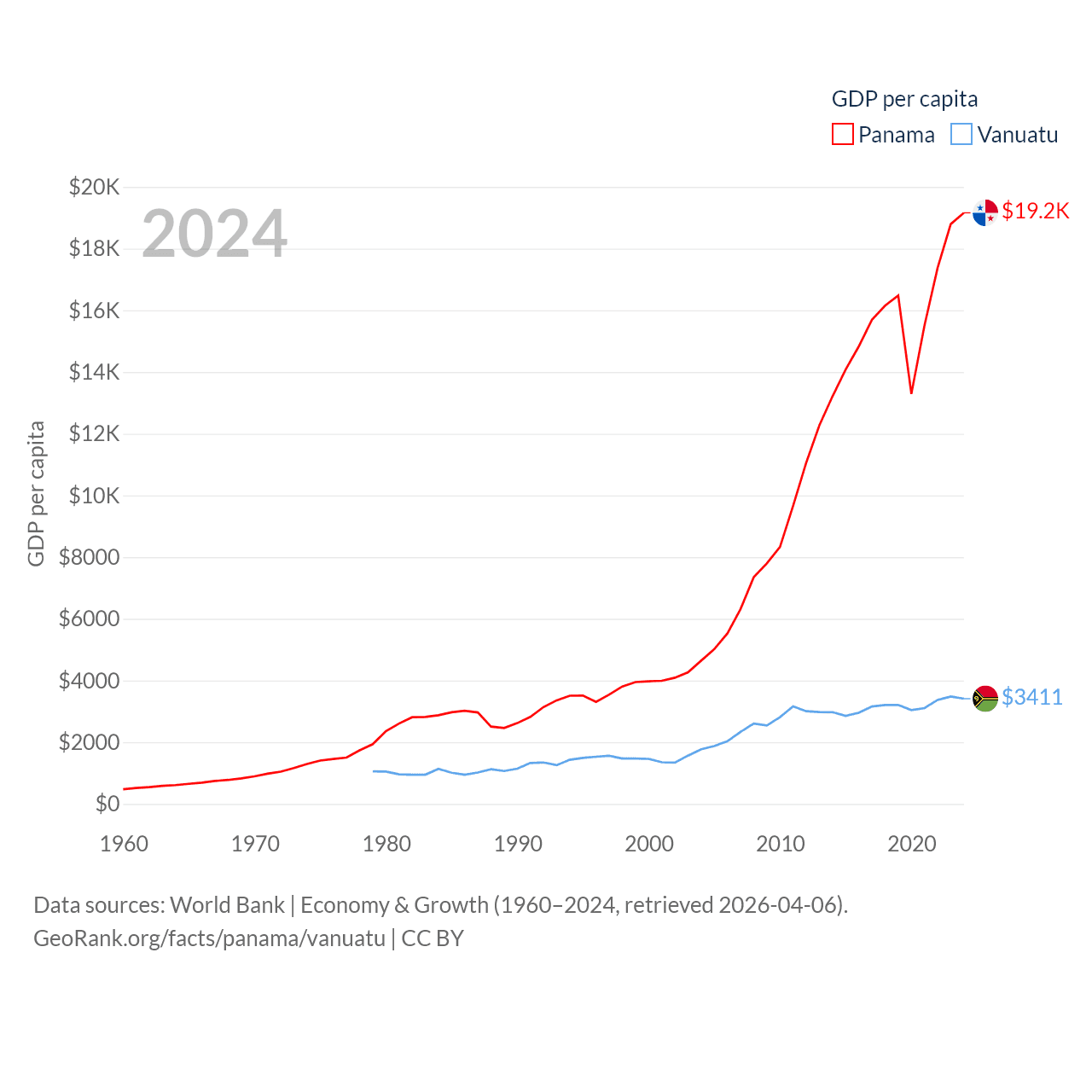 By GDP, Panama ranks 78/197 ($86.5B) and Vanuatu ranks 188/197 ($1.12B). By GDP per capita, Panama ranks 60/197 ($19,161), while Vanuatu ranks 137/197 ($3,411).