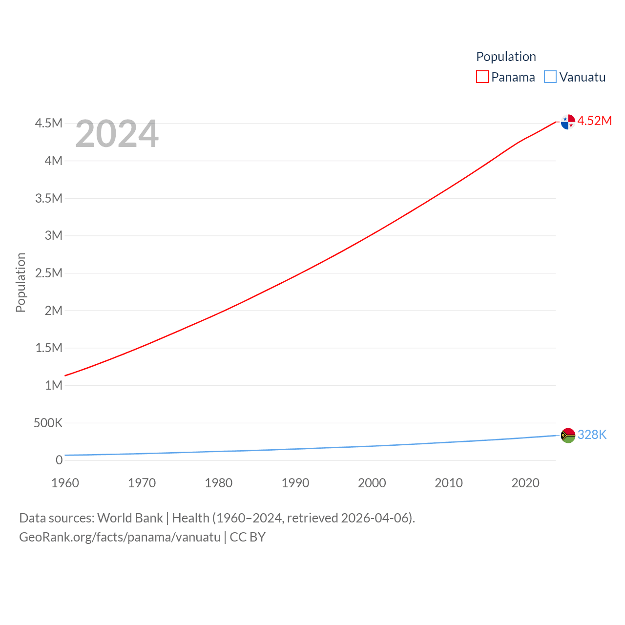 Panama has a population of 4.52M (ranked 128/197), compared with 328K in Vanuatu (ranked 174/197). Panama's land area is 28,641 sq mi versus 4,707 sq mi for Vanuatu (ranked 115th vs. 157th).
