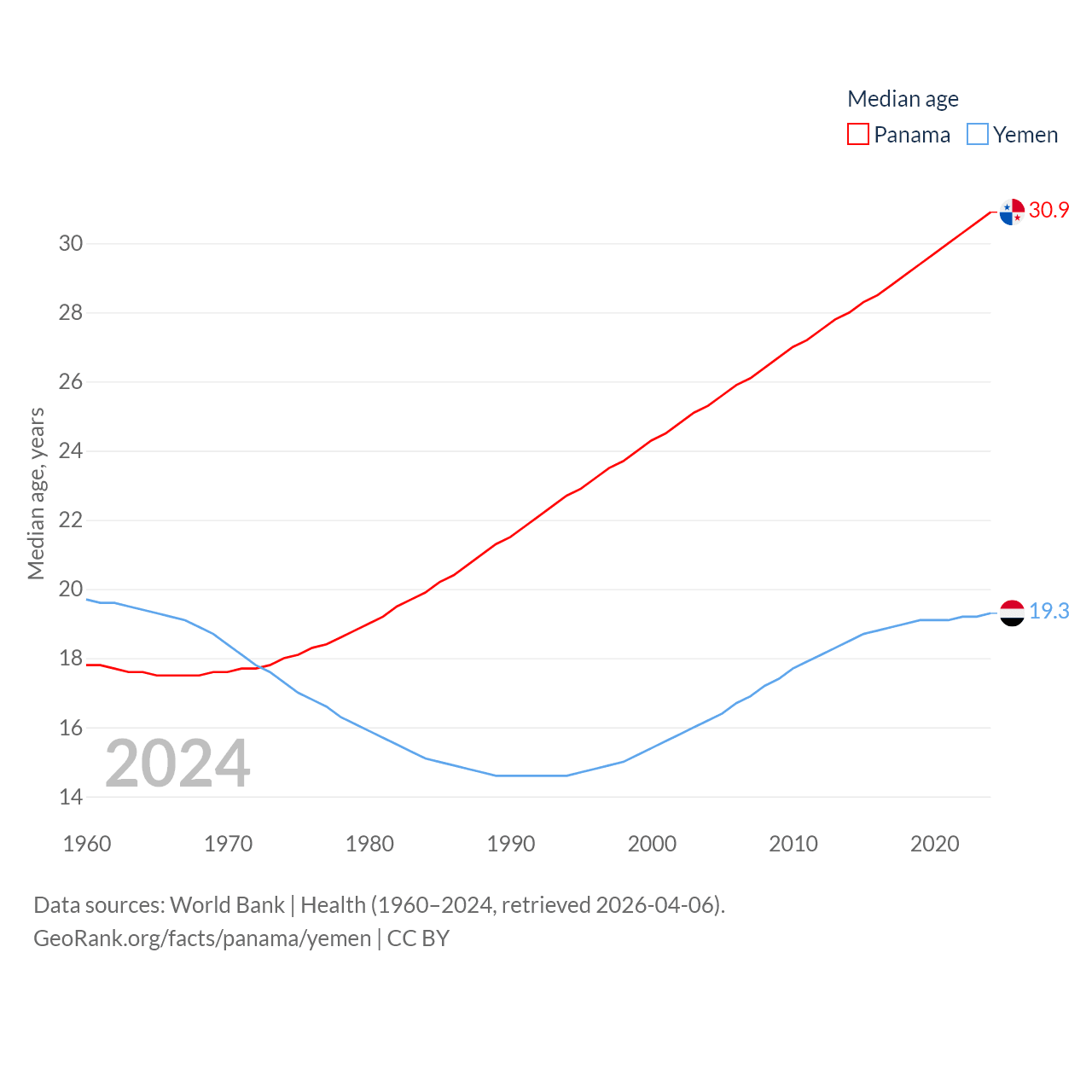 Panama has a population of 4.52M (ranked 128/197), compared with 40.6M in Yemen (ranked 38/197). Panama's land area is 28,641 sq mi versus 203,850 sq mi for Yemen (ranked 115th vs. 49th).