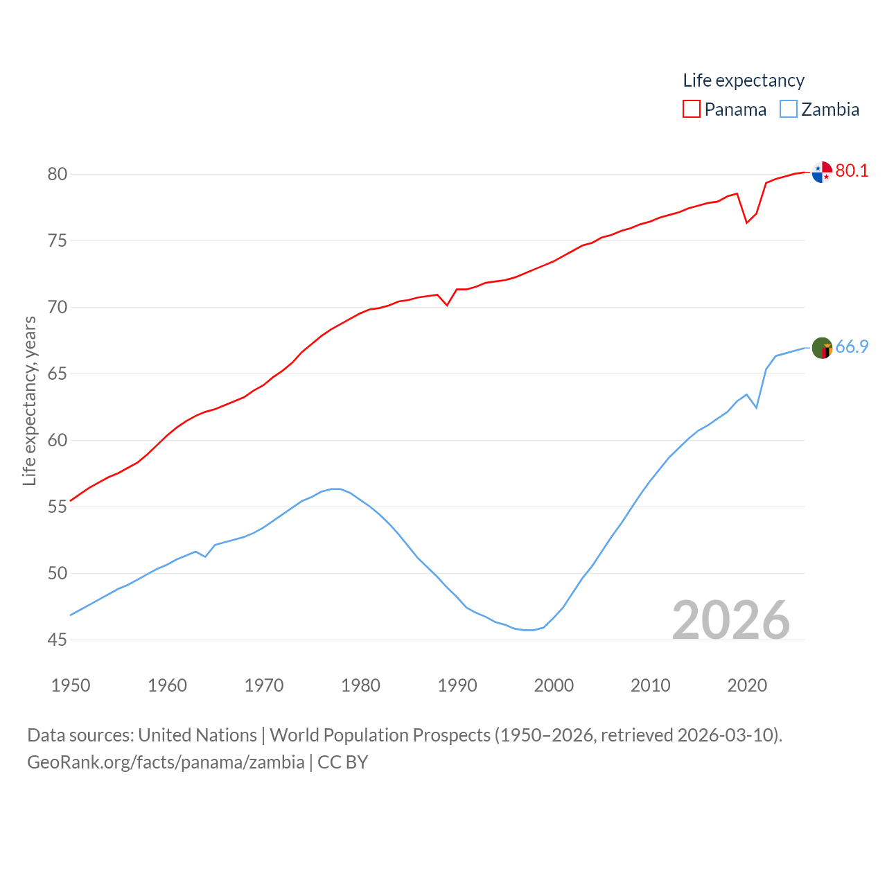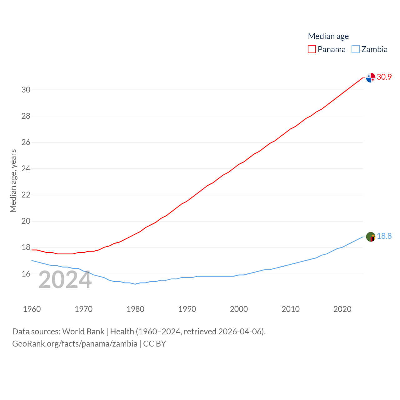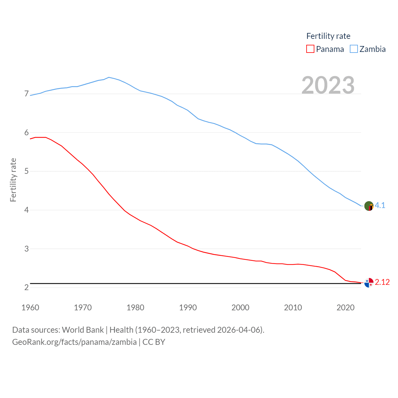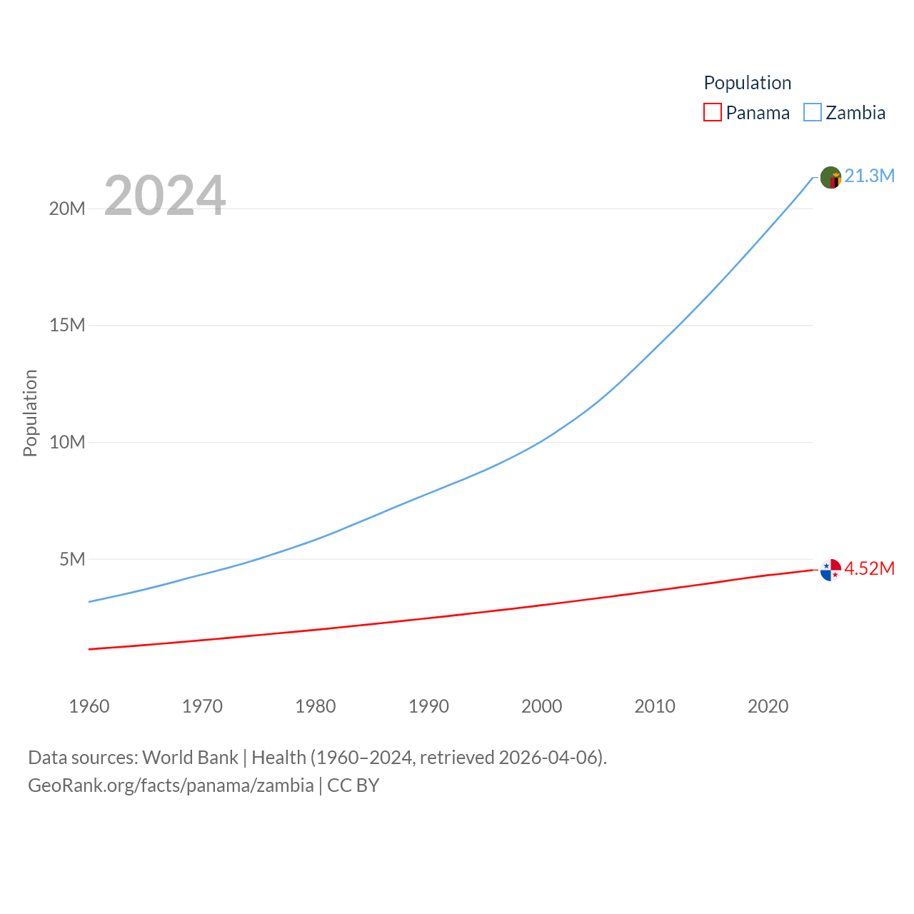 Panama has a population of 4.52M (ranked 128/197), compared with 21.3M in Zambia (ranked 63/197). Panama's land area is 28,641 sq mi versus 287,024 sq mi for Zambia (ranked 115th vs. 37th).