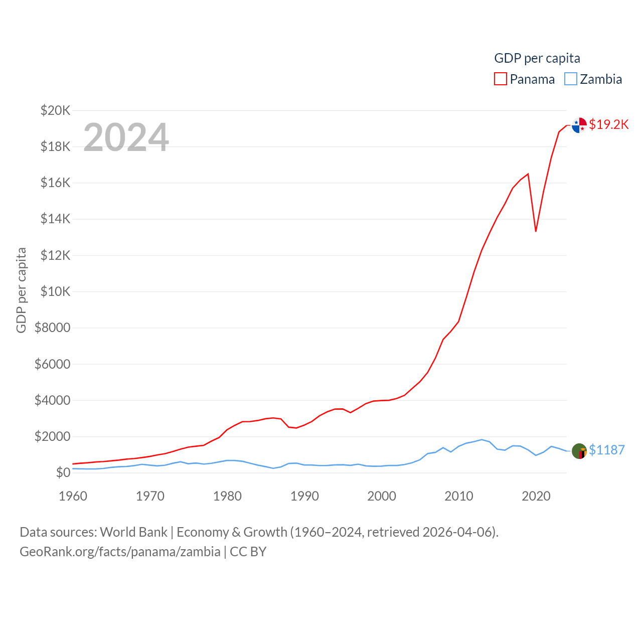 By GDP, Panama ranks 78/197 ($86.5B) and Zambia ranks 116/197 ($25.3B). By GDP per capita, Panama ranks 60/197 ($19,161), while Zambia ranks 169/197 ($1,187).