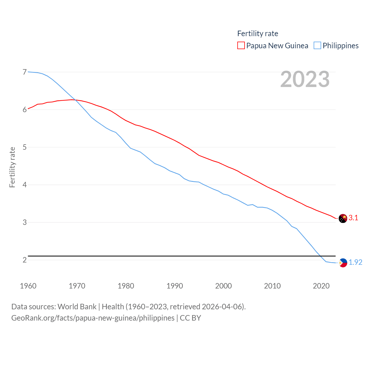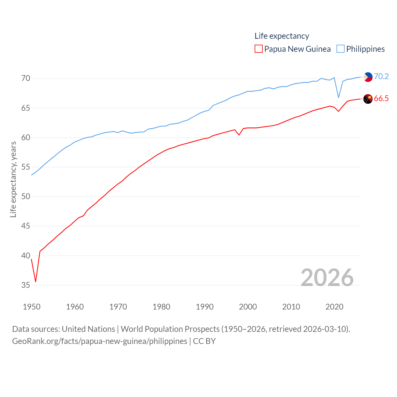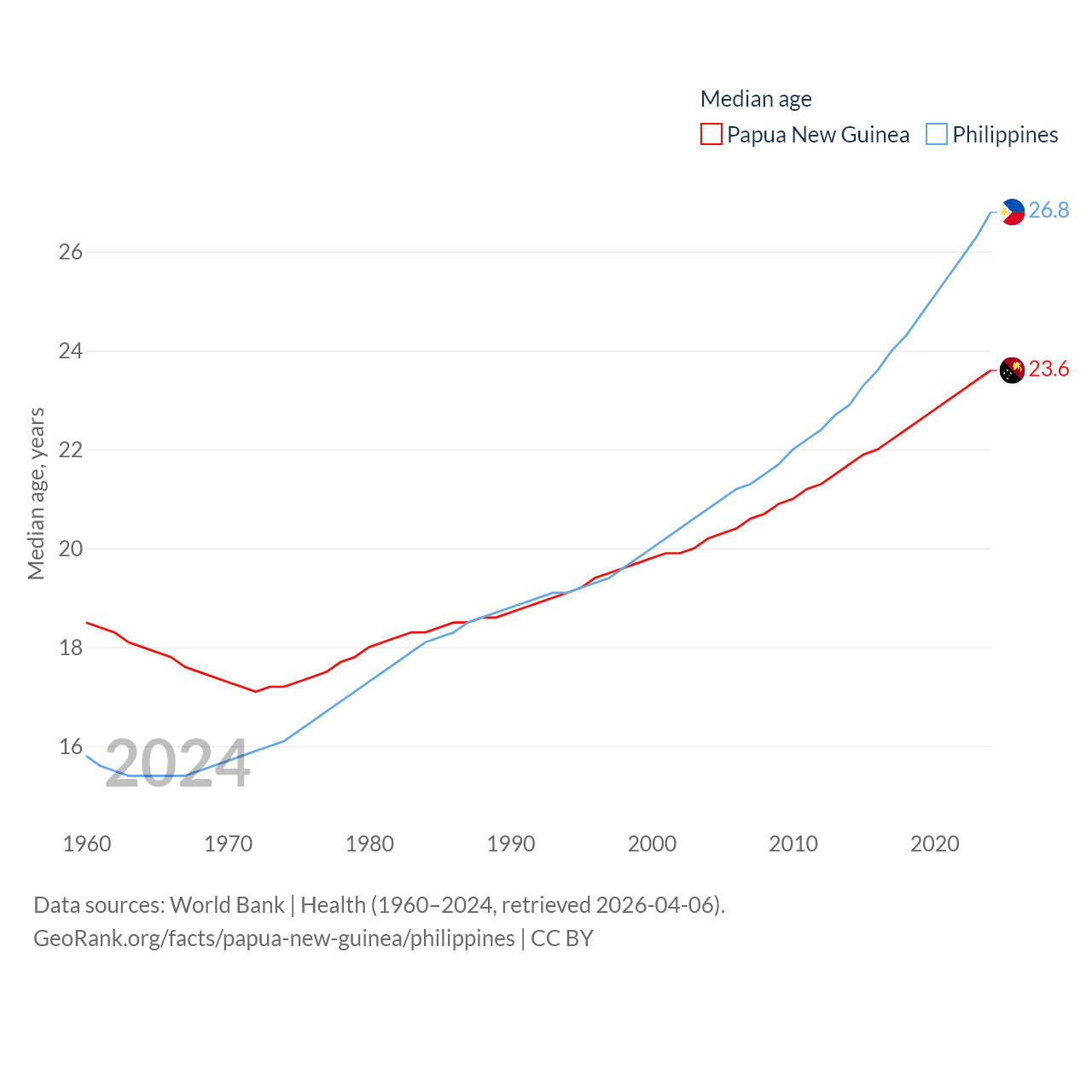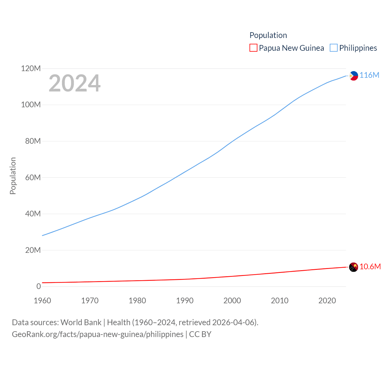 Papua New Guinea has a population of 10.6M (ranked 92/197), compared with 116M in The Philippines (ranked 14/197). Papua New Guinea's land area is 174,850 sq mi versus 115,124 sq mi for The Philippines (ranked 54th vs. 71st).