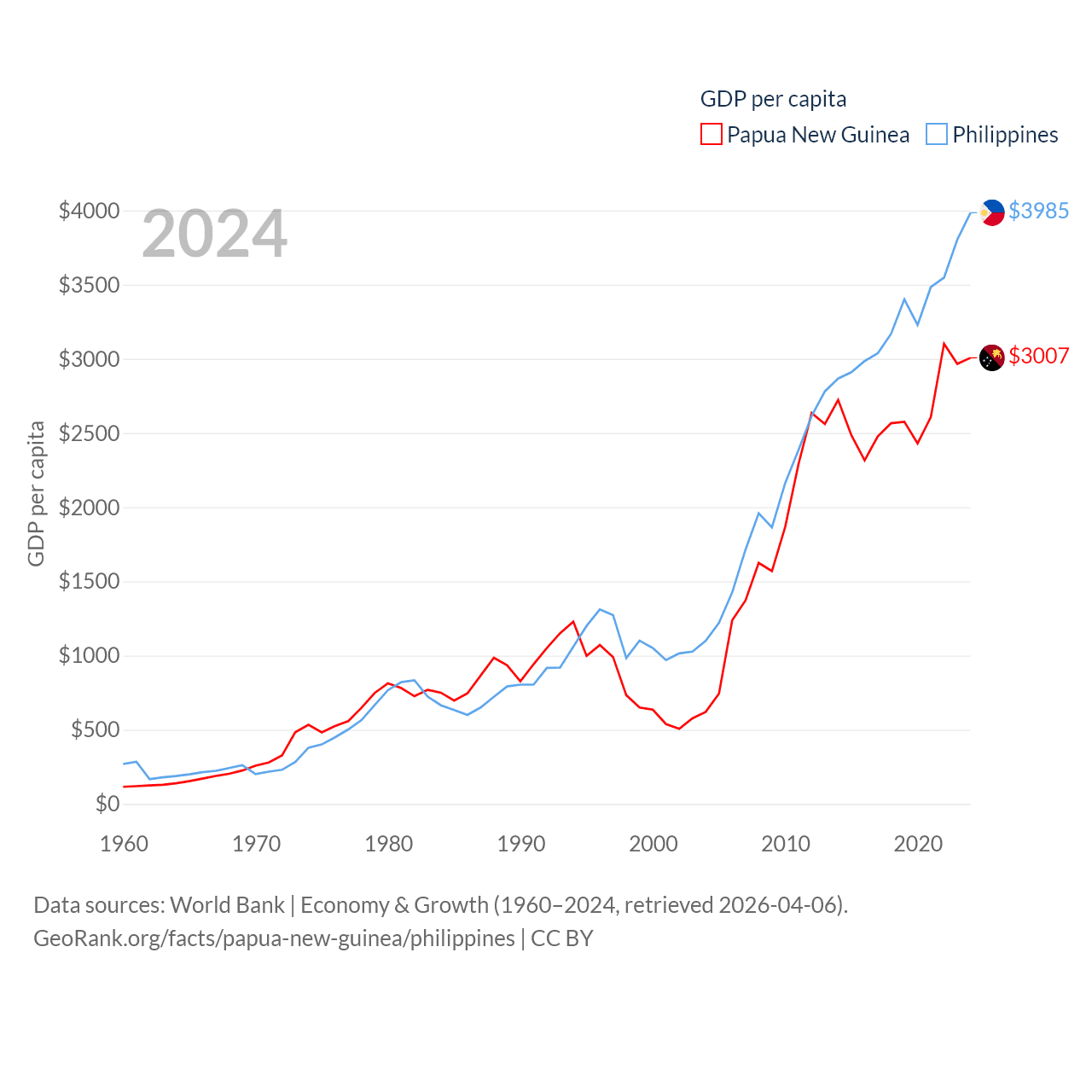 By GDP, Papua New Guinea ranks 110/197 ($31.8B) and The Philippines ranks 35/197 ($462B). By GDP per capita, Papua New Guinea ranks 140/197 ($3,007), while The Philippines ranks 130/197 ($3,985).