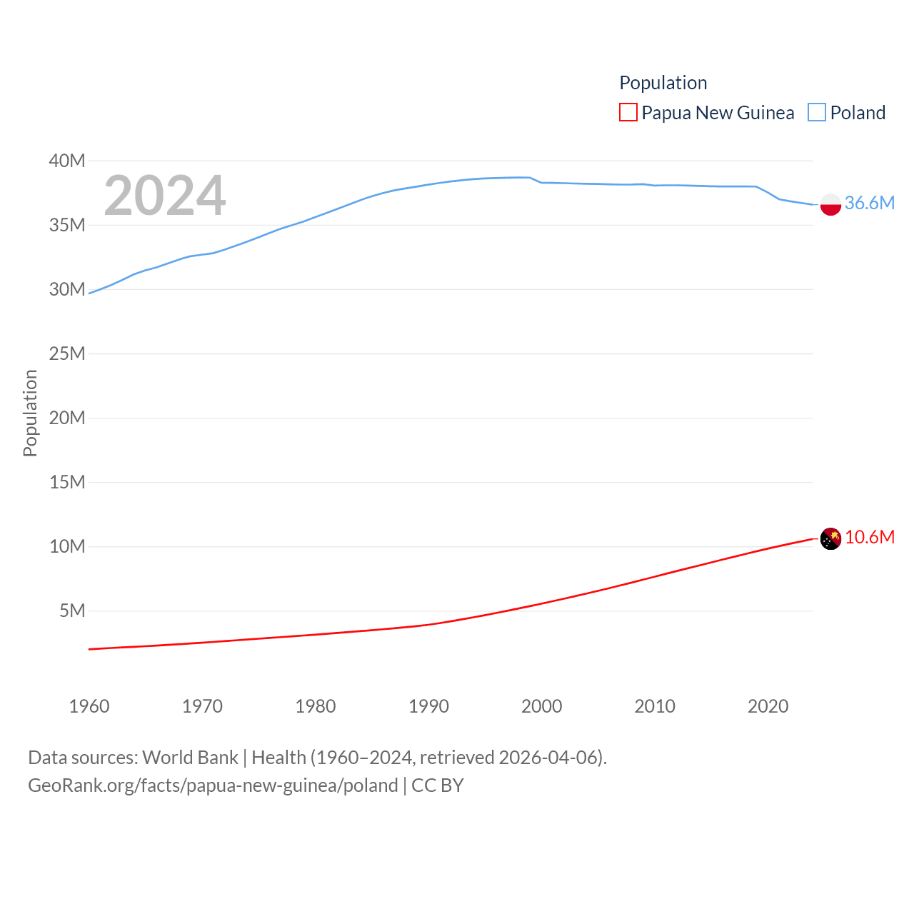 Papua New Guinea has a population of 10.6M (ranked 92/197), compared with 36.6M in Poland (ranked 42/197). Papua New Guinea's land area is 174,850 sq mi versus 118,252 sq mi for Poland (ranked 54th vs. 69th).