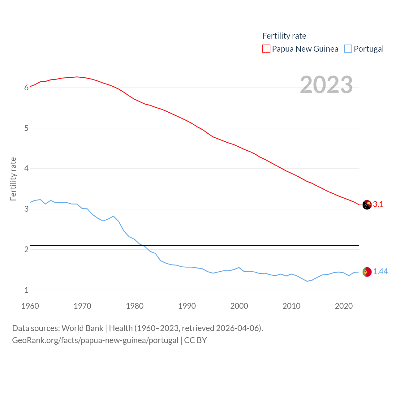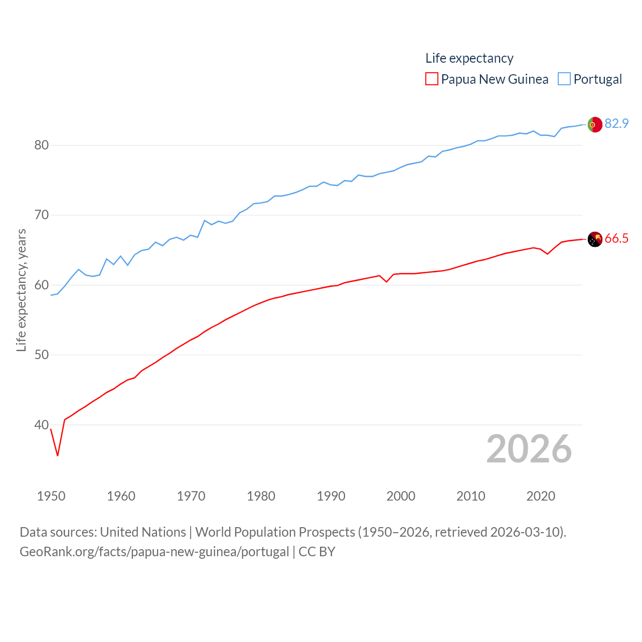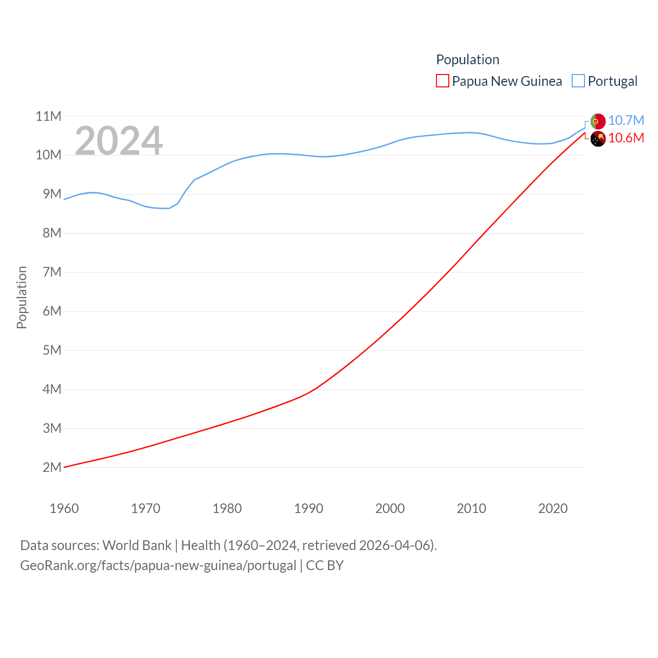 Papua New Guinea has a population of 10.6M (ranked 92/197), compared with 10.7M in Portugal (ranked 90/197). Papua New Guinea's land area is 174,850 sq mi versus 35,369 sq mi for Portugal (ranked 54th vs. 108th).