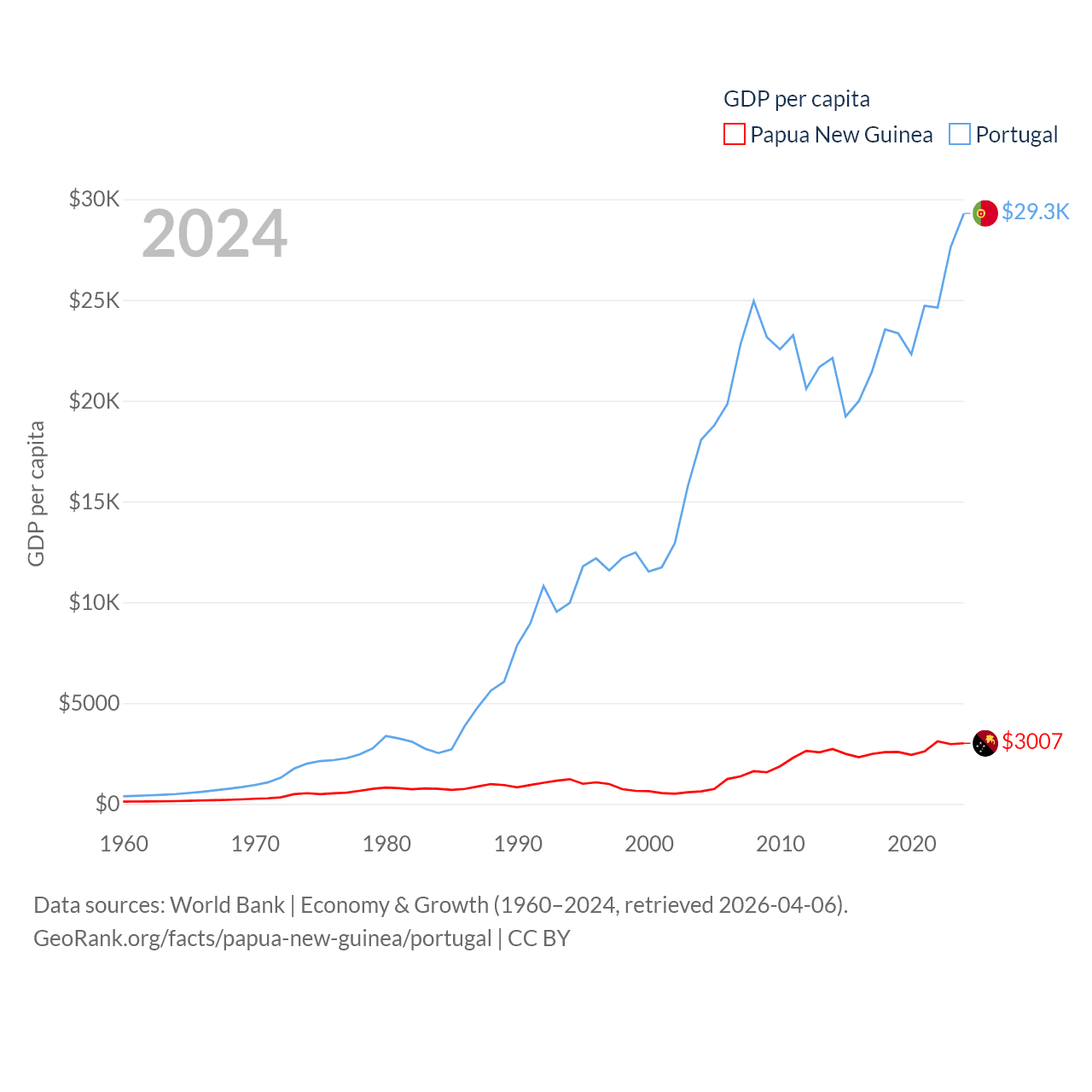 By GDP, Papua New Guinea ranks 110/197 ($31.8B) and Portugal ranks 46/197 ($313B). By GDP per capita, Papua New Guinea ranks 140/197 ($3,007), while Portugal ranks 44/197 ($29,292).