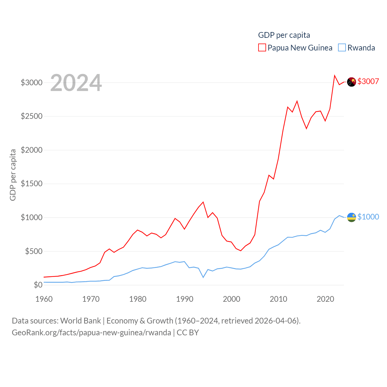 By GDP, Papua New Guinea ranks 110/197 ($31.8B) and Rwanda ranks 144/197 ($14.3B). By GDP per capita, Papua New Guinea ranks 140/197 ($3,007), while Rwanda ranks 178/197 ($1,000).