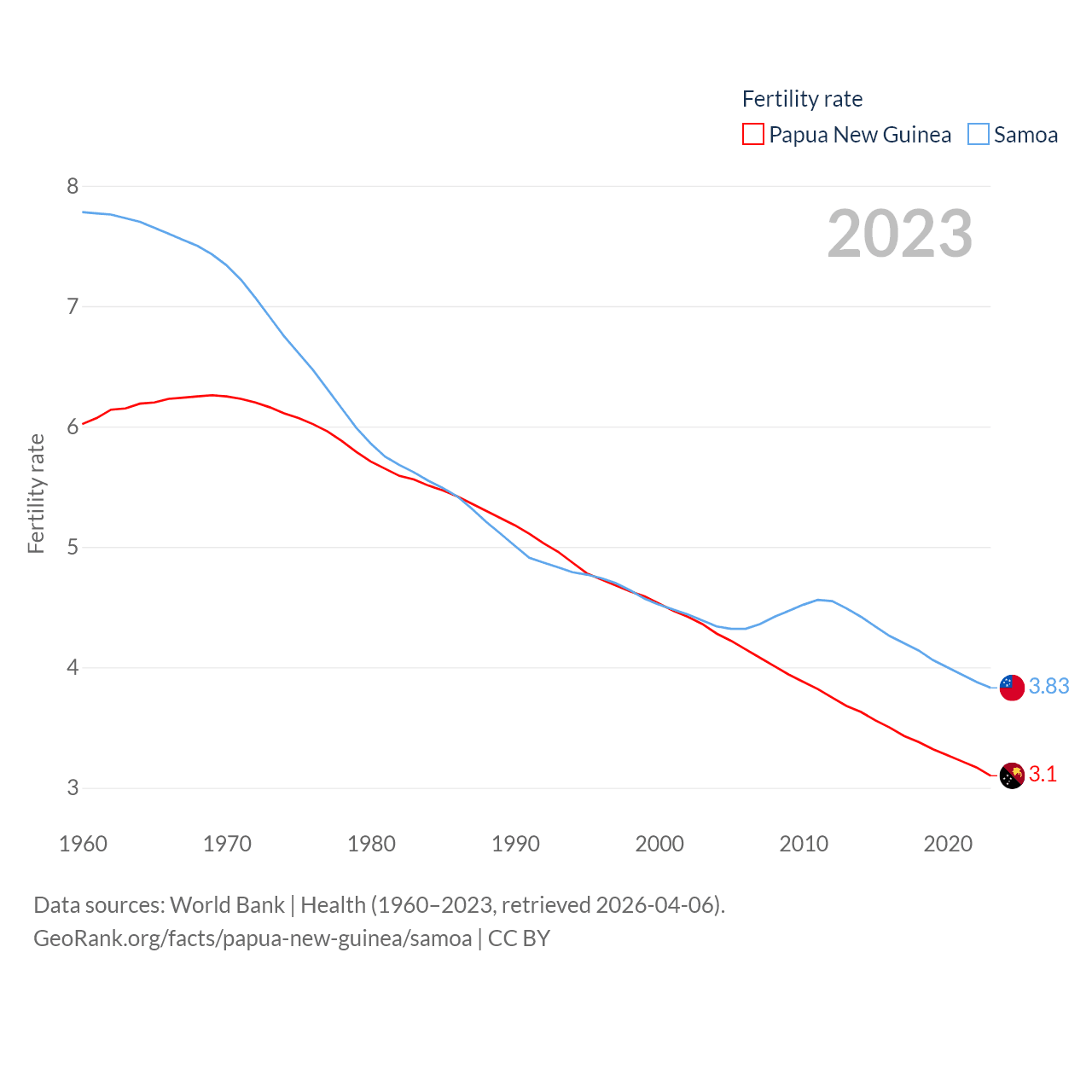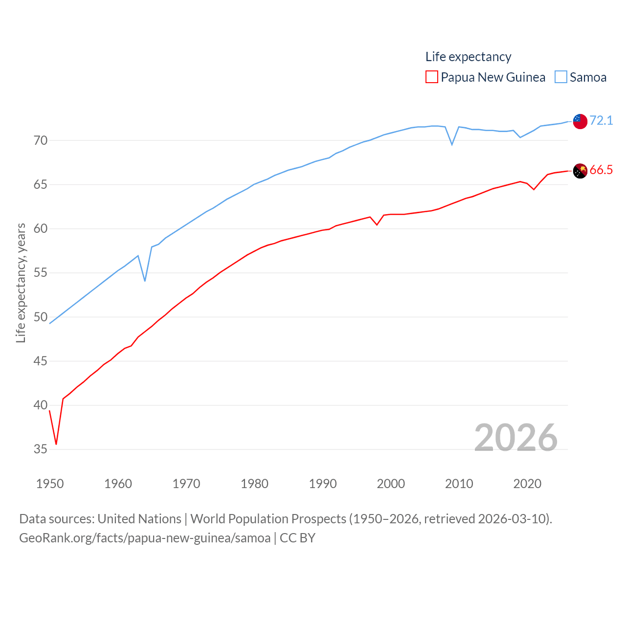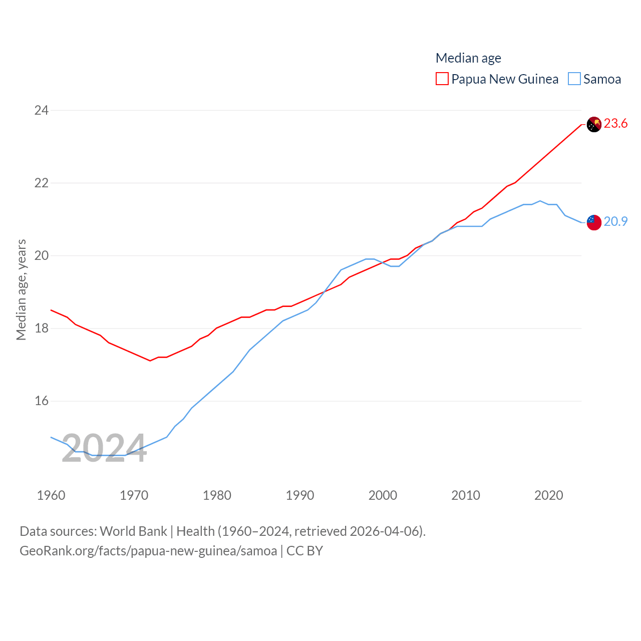 Papua New Guinea has a population of 10.6M (ranked 92/197), compared with 218K in Samoa (ranked 177/197). Papua New Guinea's land area is 174,850 sq mi versus 1,073 sq mi for Samoa (ranked 54th vs. 168th).