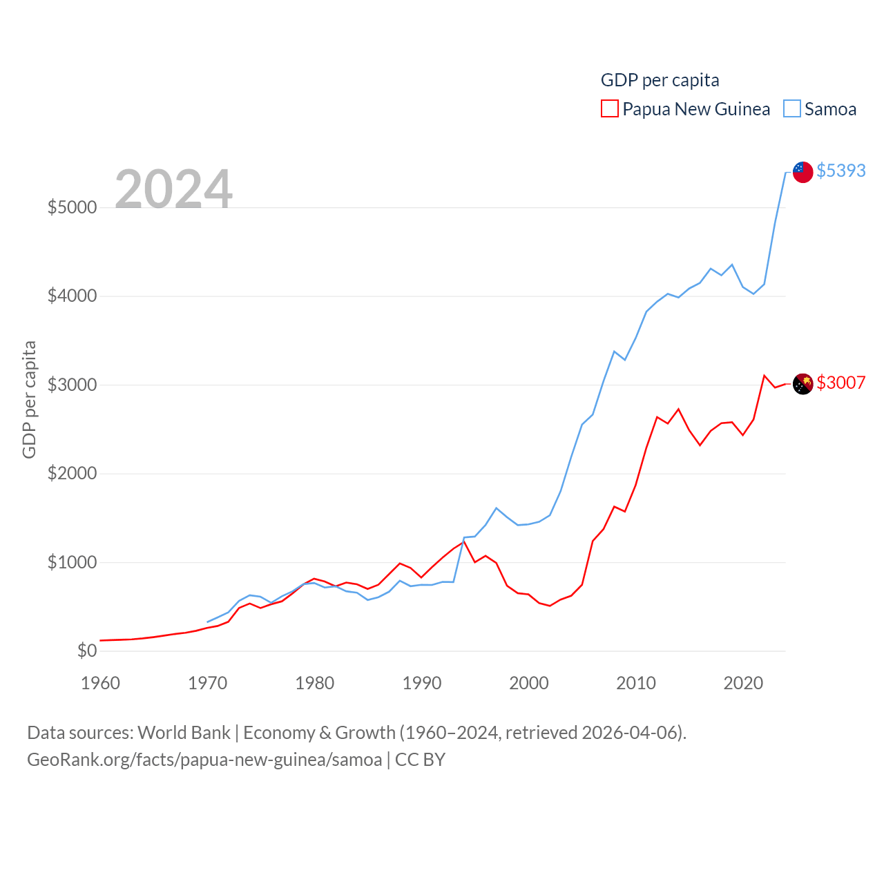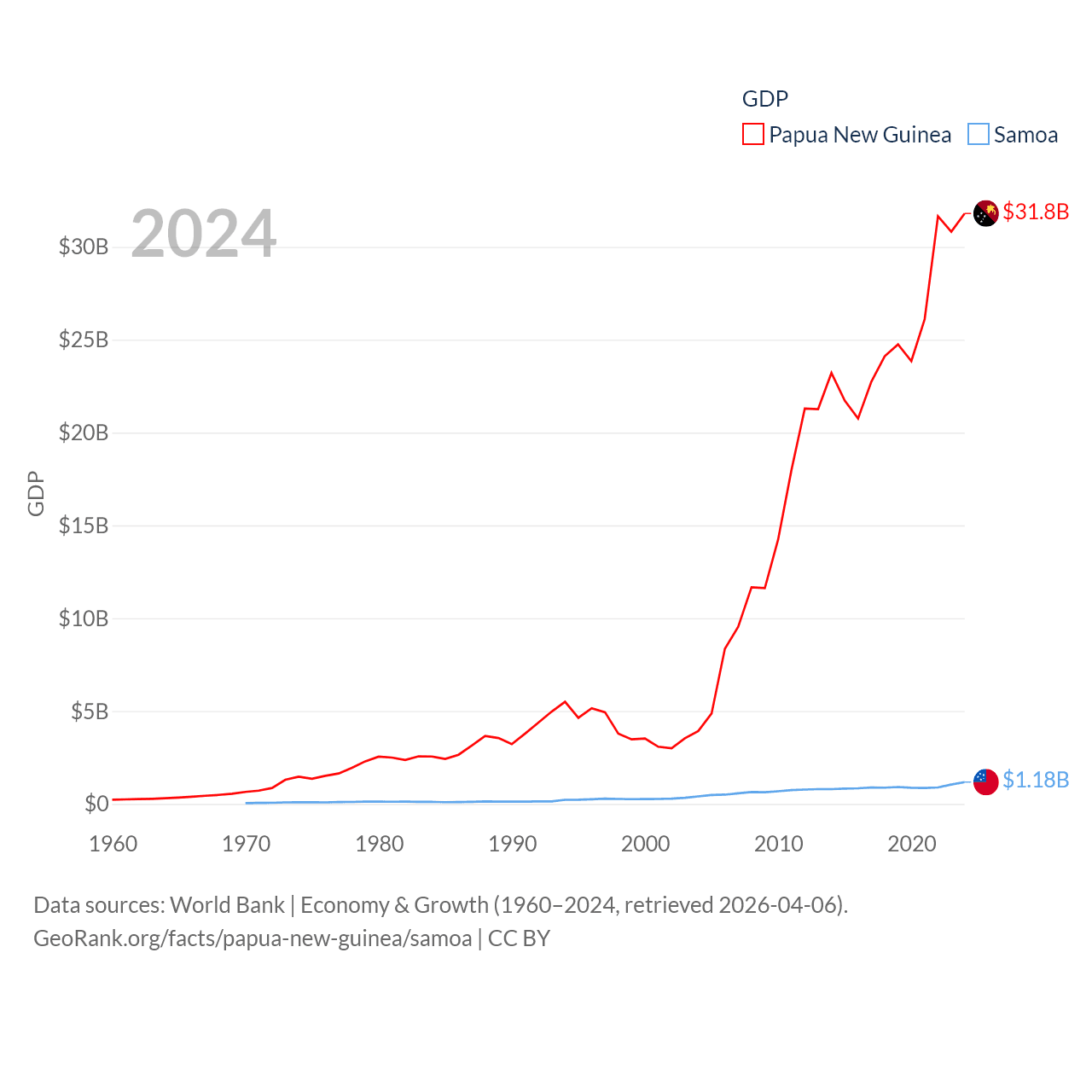 By GDP, Papua New Guinea ranks 110/197 ($31.8B) and Samoa ranks 185/197 ($1.18B). By GDP per capita, Papua New Guinea ranks 140/197 ($3,007), while Samoa ranks 117/197 ($5,393).