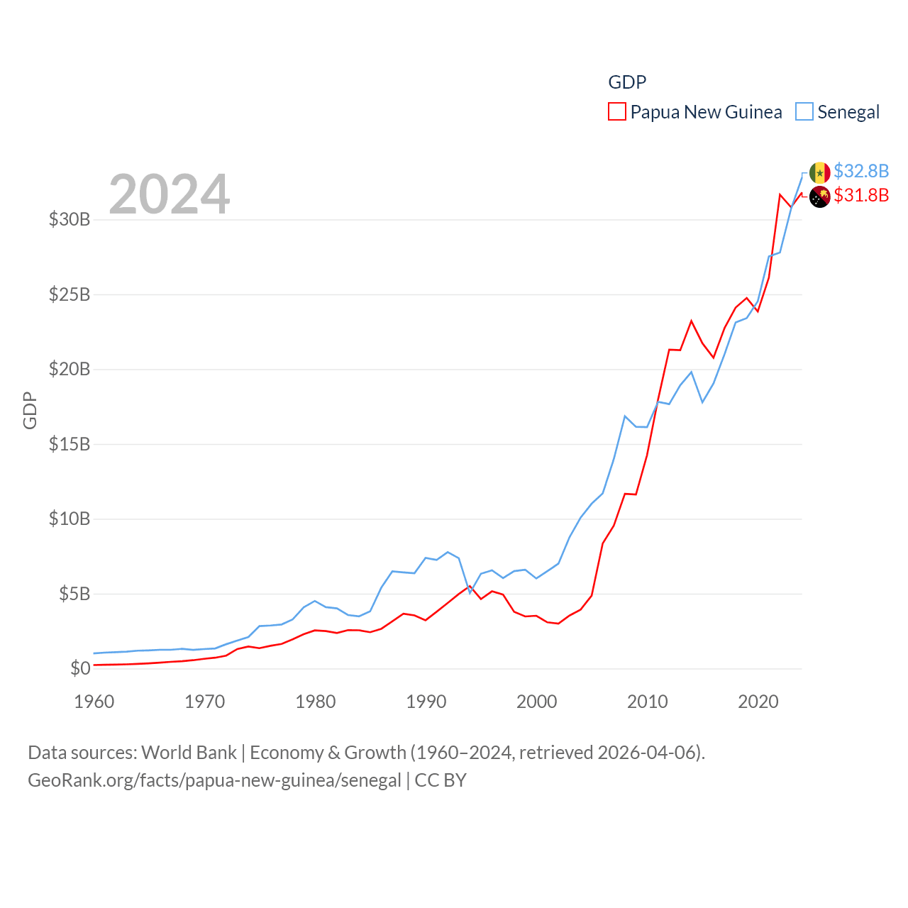 By GDP, Papua New Guinea ranks 110/197 ($31.8B) and Senegal ranks 109/197 ($32.8B). By GDP per capita, Papua New Guinea ranks 140/197 ($3,007), while Senegal ranks 159/197 ($1,773).