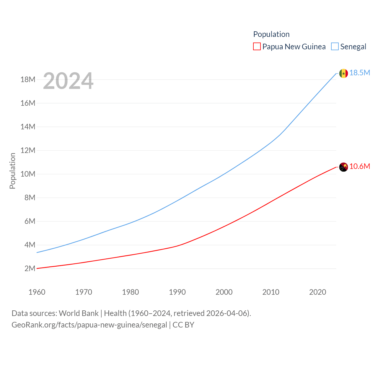 Papua New Guinea has a population of 10.6M (ranked 92/197), compared with 18.5M in Senegal (ranked 69/197). Papua New Guinea's land area is 174,850 sq mi versus 74,336 sq mi for Senegal (ranked 54th vs. 85th).
