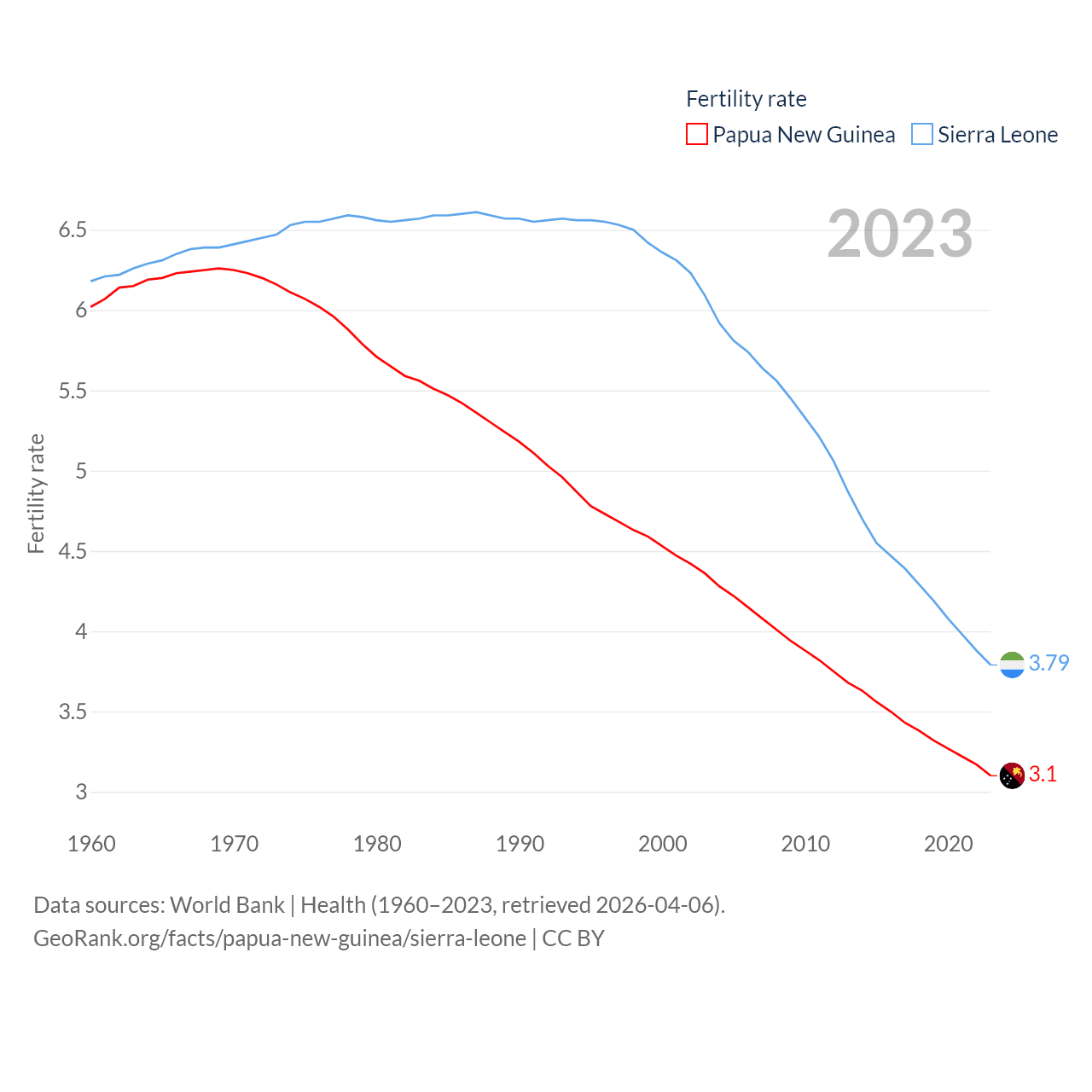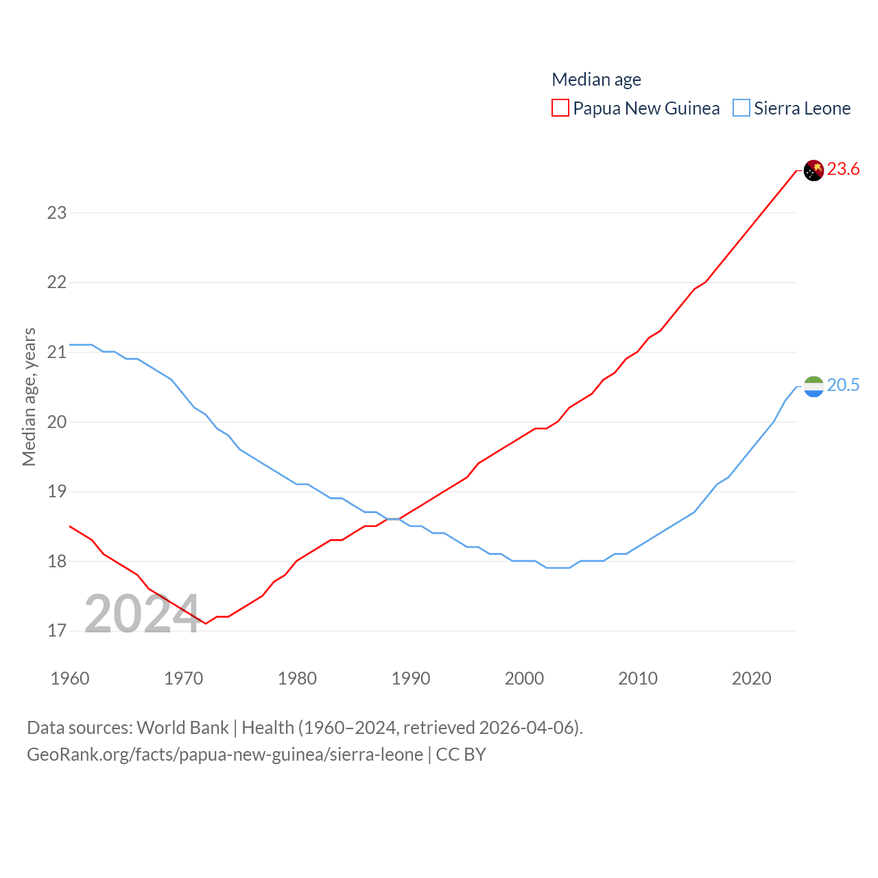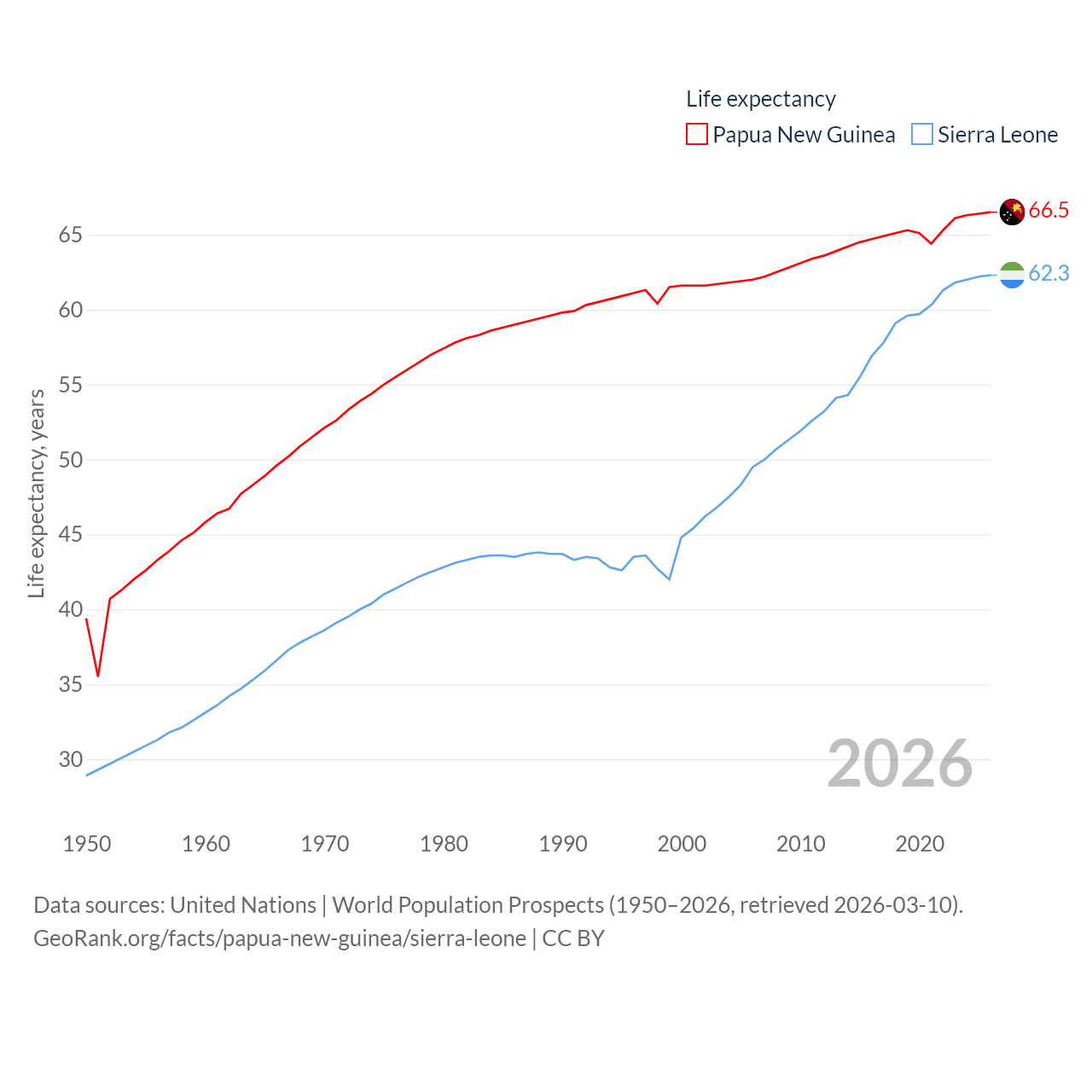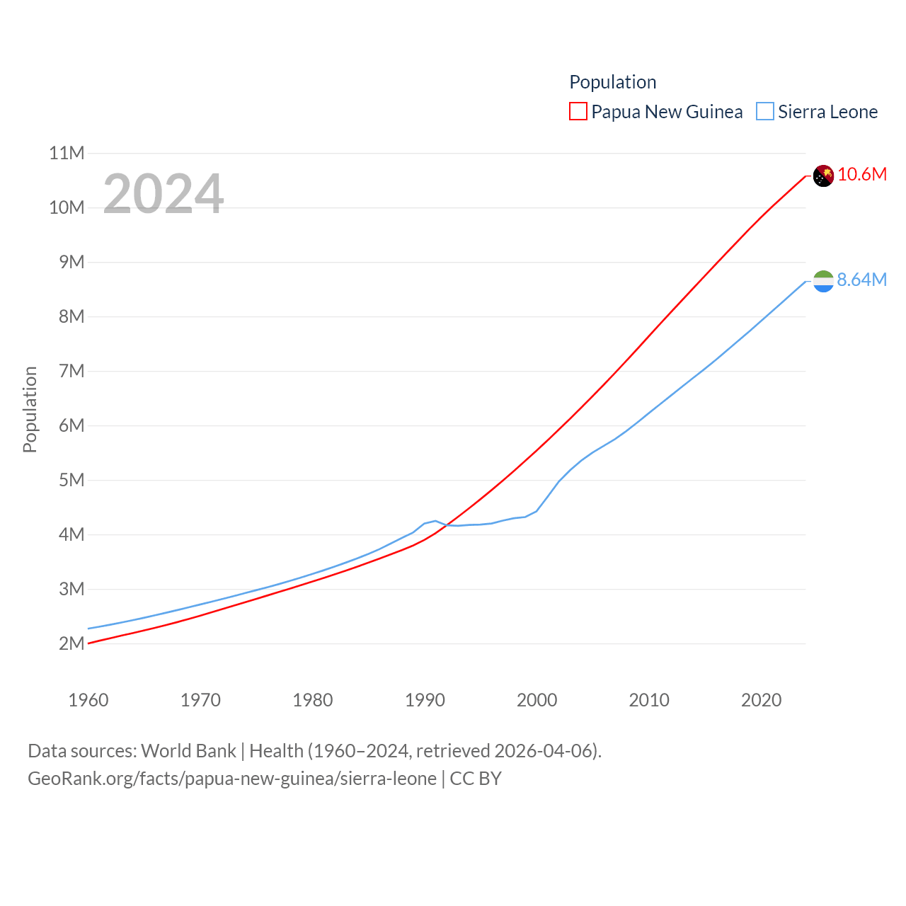 Papua New Guinea has a population of 10.6M (ranked 92/197), compared with 8.64M in Sierra Leone (ranked 102/197). Papua New Guinea's land area is 174,850 sq mi versus 27,869 sq mi for Sierra Leone (ranked 54th vs. 116th).