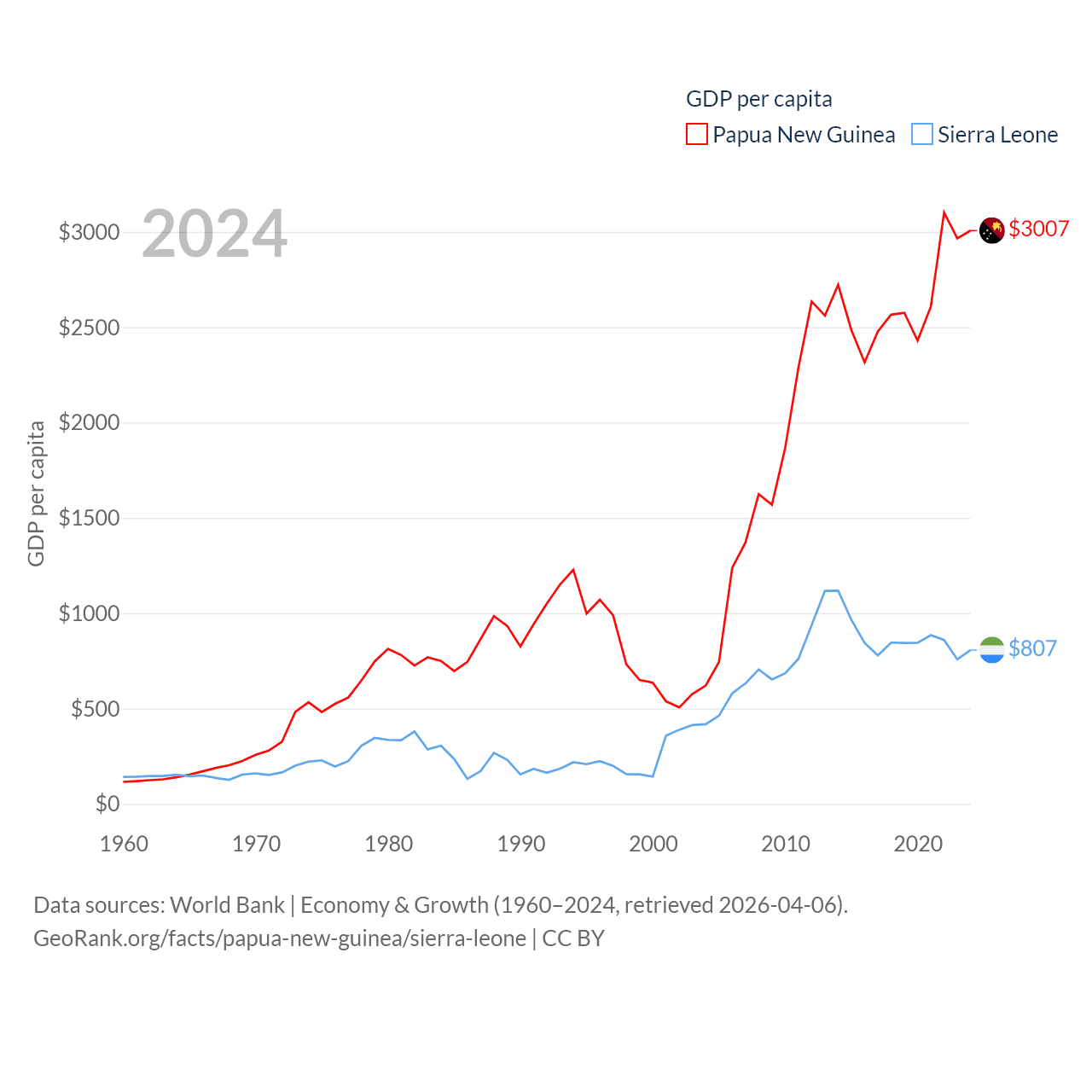 By GDP, Papua New Guinea ranks 110/197 ($31.8B) and Sierra Leone ranks 160/197 ($6.97B). By GDP per capita, Papua New Guinea ranks 140/197 ($3,007), while Sierra Leone ranks 186/197 ($807).