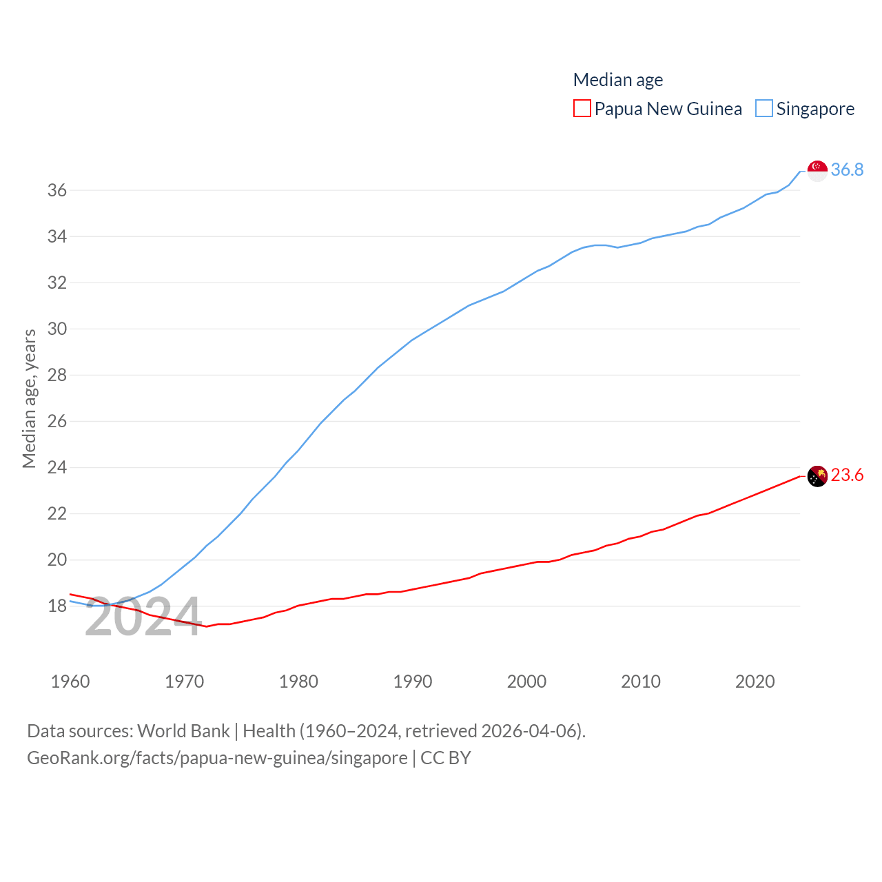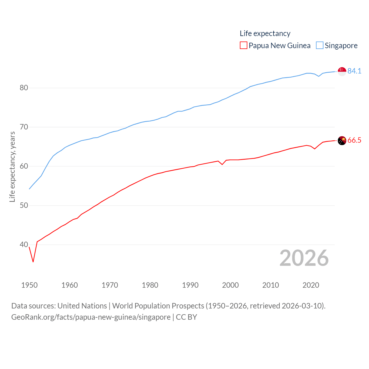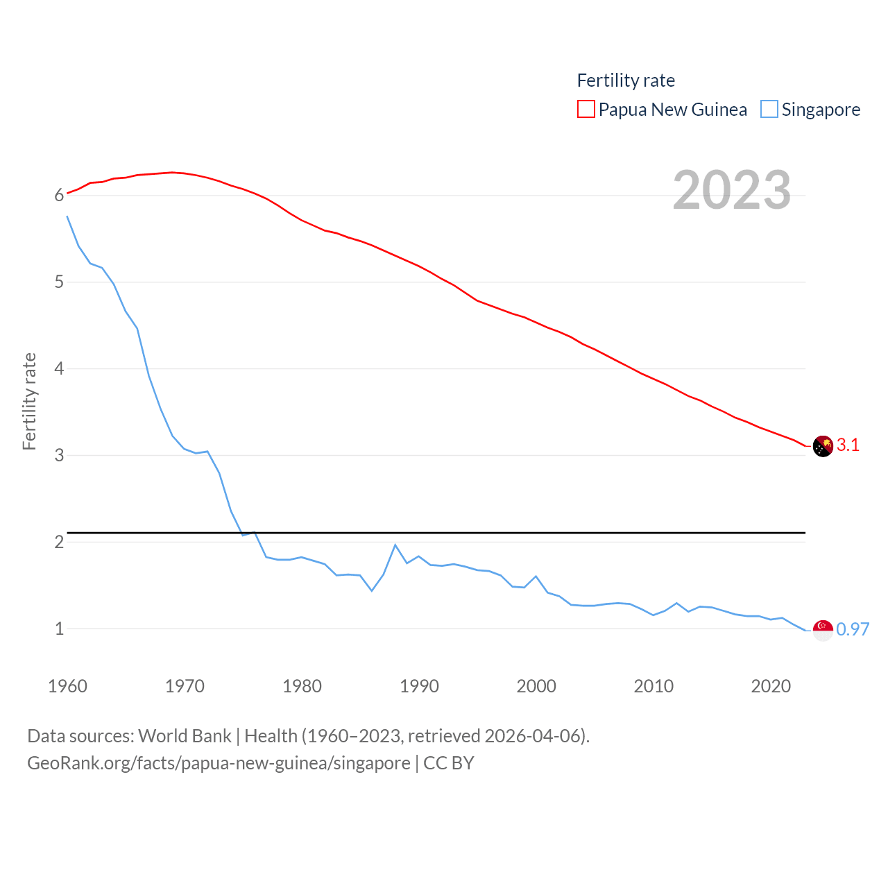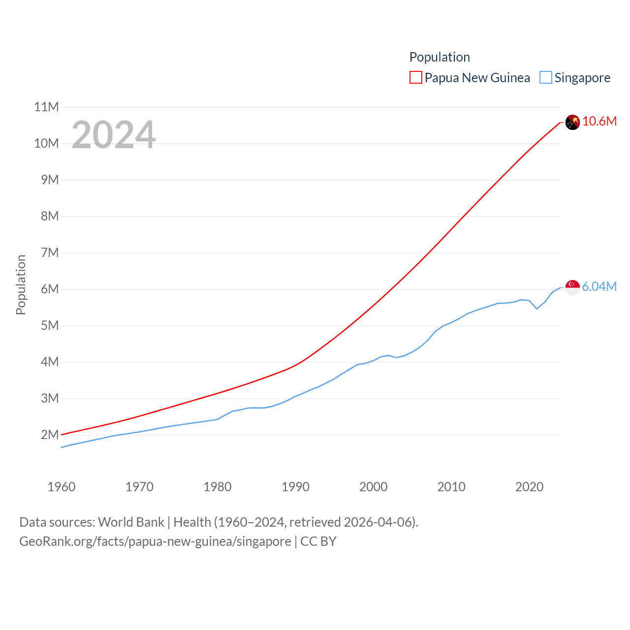 Papua New Guinea has a population of 10.6M (ranked 92/197), compared with 6.04M in Singapore (ranked 113/197). Papua New Guinea's land area is 174,850 sq mi versus 277.2 sq mi for Singapore (ranked 54th vs. 177th).