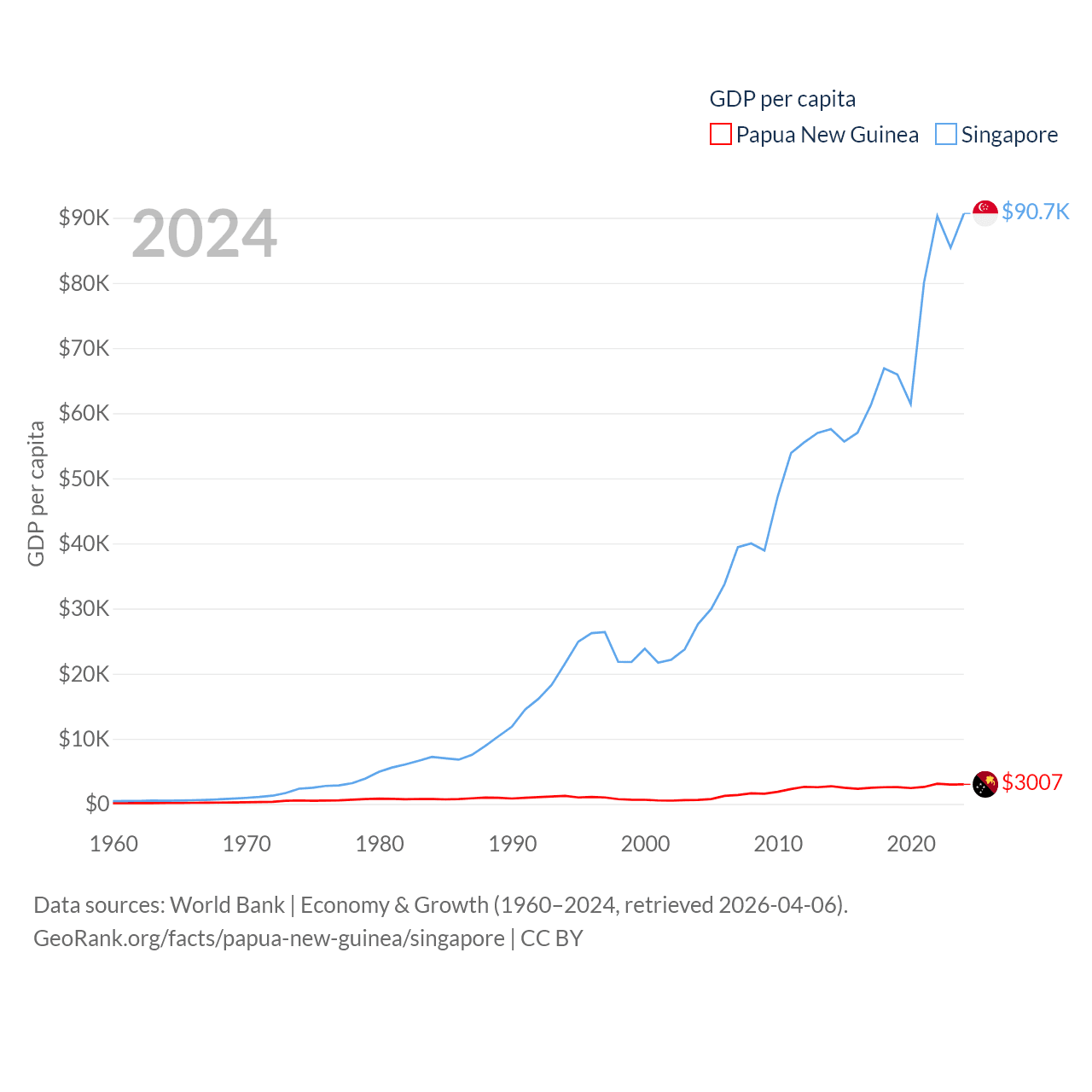 By GDP, Papua New Guinea ranks 110/197 ($31.8B) and Singapore ranks 28/197 ($547B). By GDP per capita, Papua New Guinea ranks 140/197 ($3,007), while Singapore ranks 7/197 ($90,674).