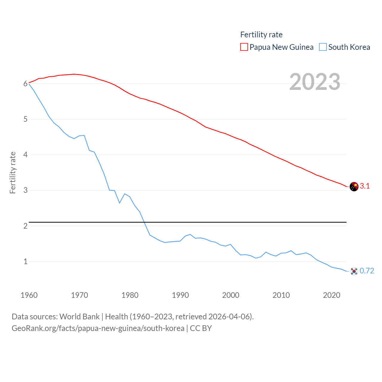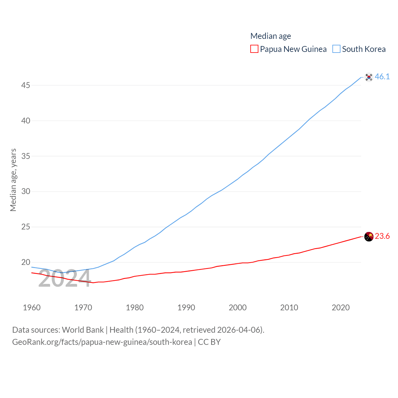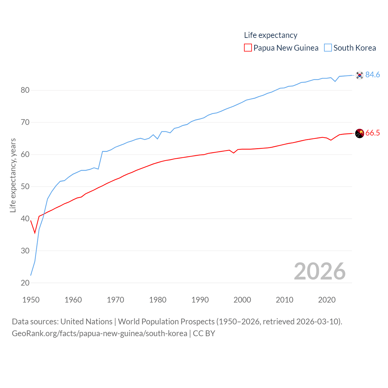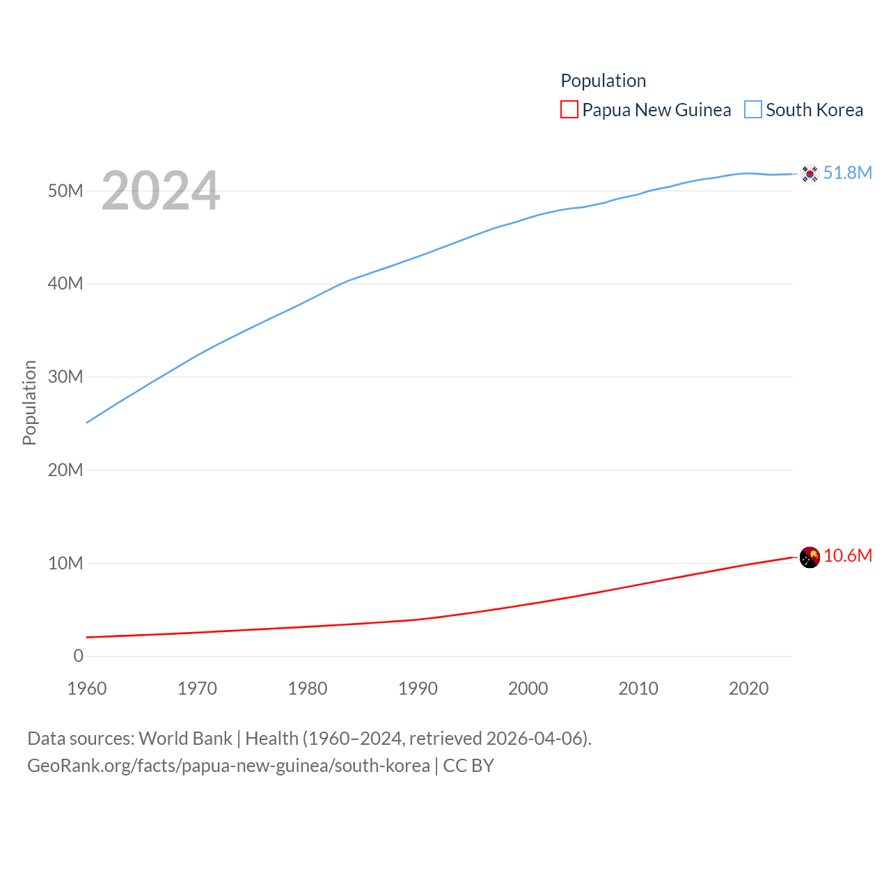 Papua New Guinea has a population of 10.6M (ranked 92/197), compared with 51.8M in South Korea (ranked 29/197). Papua New Guinea's land area is 174,850 sq mi versus 37,684 sq mi for South Korea (ranked 54th vs. 105th).