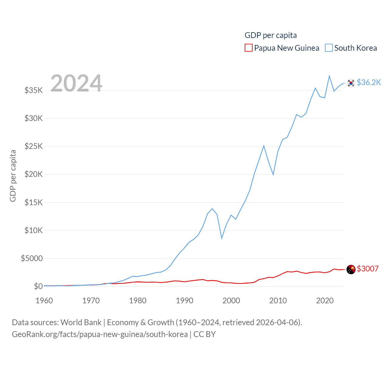 By GDP, Papua New Guinea ranks 110/197 ($31.8B) and South Korea ranks 12/197 ($1.88T). By GDP per capita, Papua New Guinea ranks 140/197 ($3,007), while South Korea ranks 31/197 ($36,239).