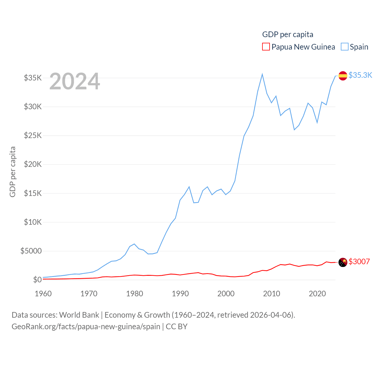 By GDP, Papua New Guinea ranks 110/197 ($31.8B) and Spain ranks 15/197 ($1.73T). By GDP per capita, Papua New Guinea ranks 140/197 ($3,007), while Spain ranks 32/197 ($35,327).