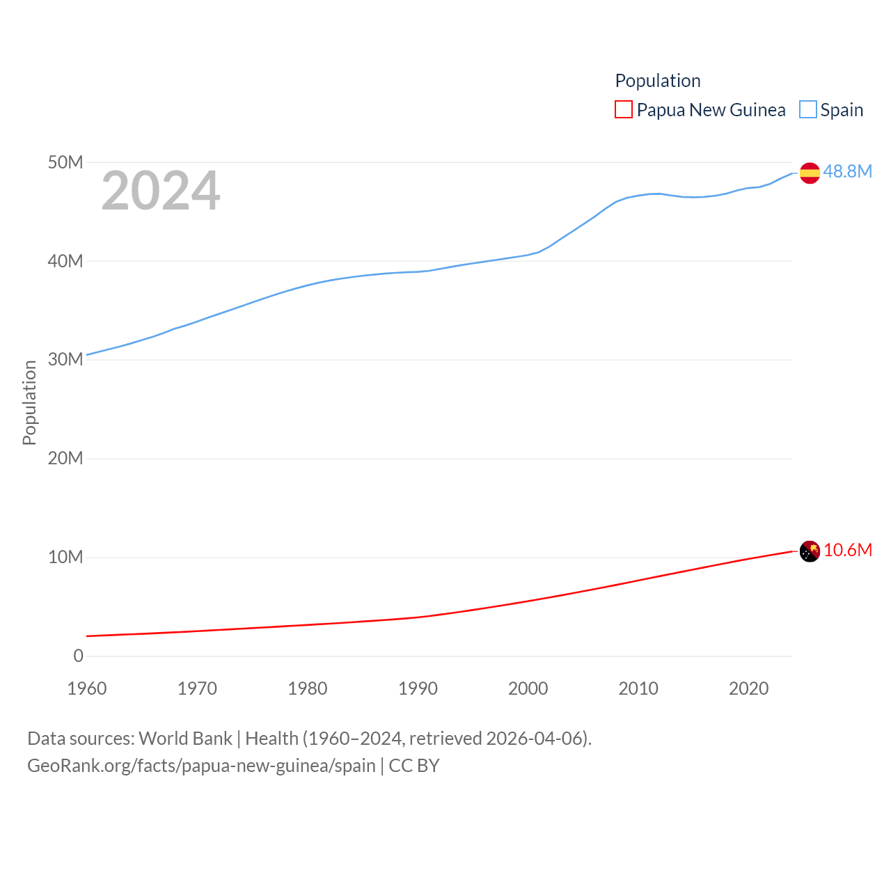 Papua New Guinea has a population of 10.6M (ranked 92/197), compared with 48.8M in Spain (ranked 32/197). Papua New Guinea's land area is 174,850 sq mi versus 192,934 sq mi for Spain (ranked 54th vs. 51st).