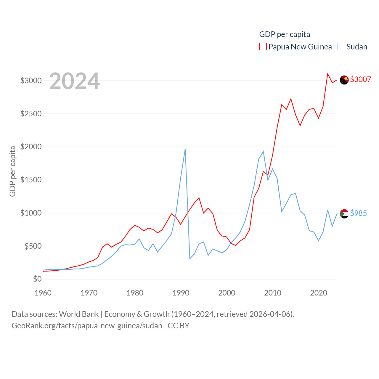 By GDP, Papua New Guinea ranks 110/197 ($31.8B) and Sudan ranks 94/197 ($49.7B). By GDP per capita, Papua New Guinea ranks 140/197 ($3,007), while Sudan ranks 179/197 ($985).