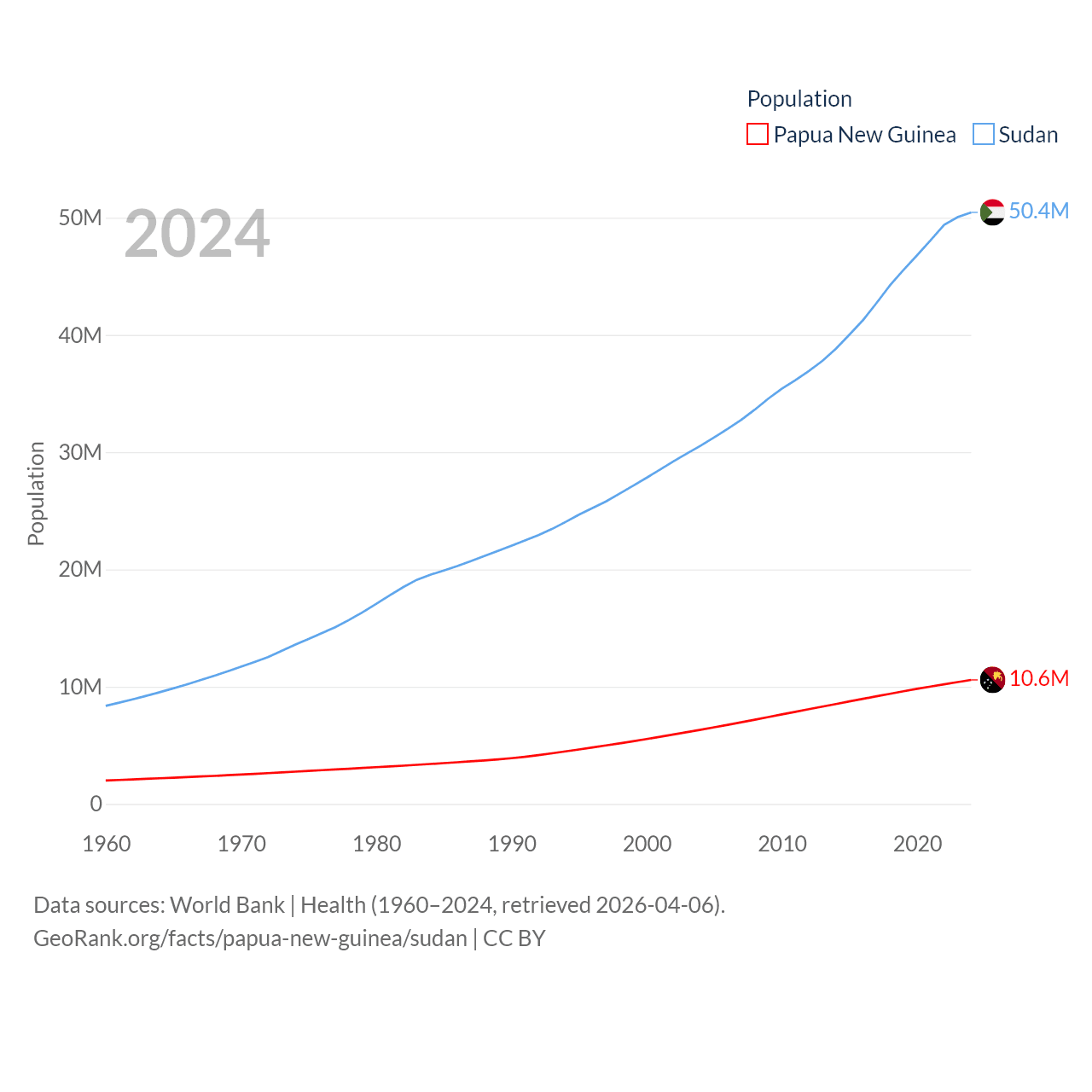 Papua New Guinea has a population of 10.6M (ranked 92/197), compared with 50.4M in Sudan (ranked 30/197). Papua New Guinea's land area is 174,850 sq mi versus 721,239 sq mi for Sudan (ranked 54th vs. 15th).