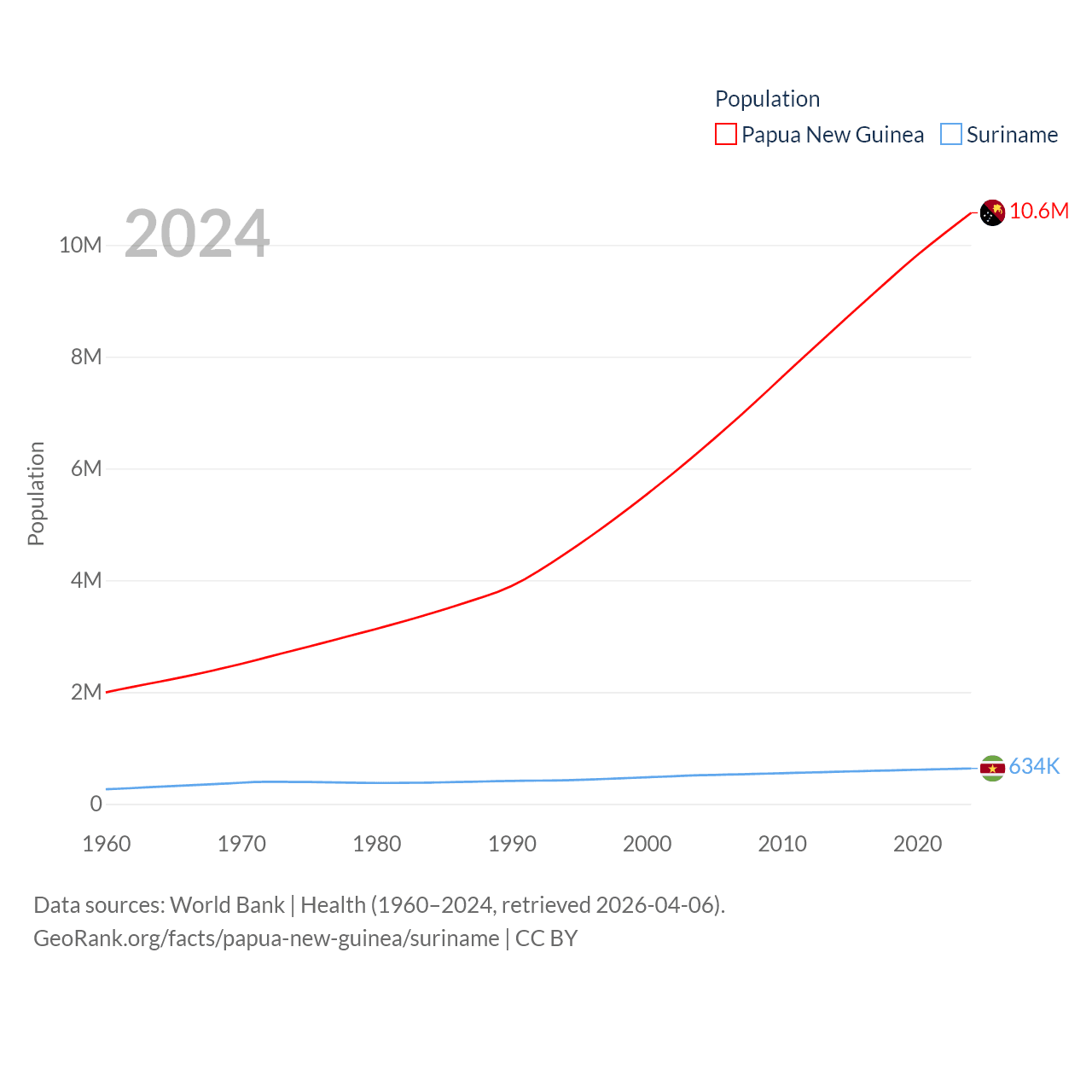 Papua New Guinea has a population of 10.6M (ranked 92/197), compared with 634K in Suriname (ranked 165/197). Papua New Guinea's land area is 174,850 sq mi versus 61,972 sq mi for Suriname (ranked 54th vs. 90th).