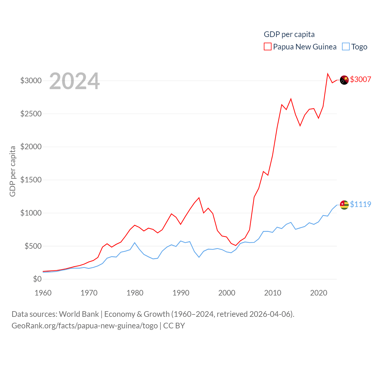 By GDP, Papua New Guinea ranks 110/197 ($31.8B) and Togo ranks 154/197 ($10.7B). By GDP per capita, Papua New Guinea ranks 140/197 ($3,007), while Togo ranks 172/197 ($1,119).