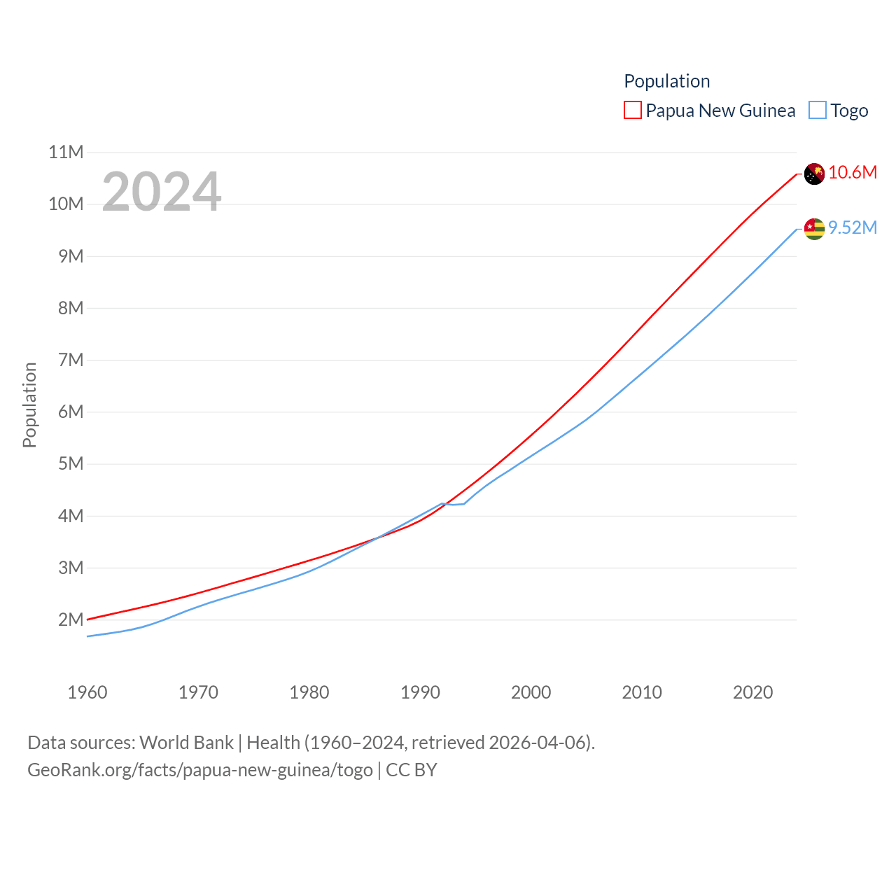 Papua New Guinea has a population of 10.6M (ranked 92/197), compared with 9.52M in Togo (ranked 98/197). Papua New Guinea's land area is 174,850 sq mi versus 21,000 sq mi for Togo (ranked 54th vs. 124th).