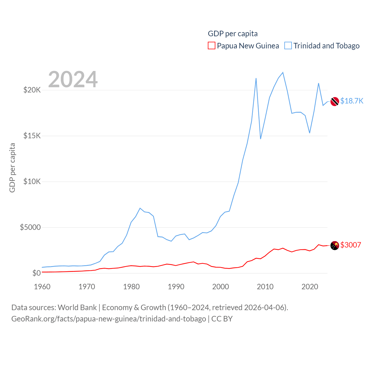 By GDP, Papua New Guinea ranks 110/197 ($31.8B) and Trinidad and Tobago ranks 115/197 ($25.6B). By GDP per capita, Papua New Guinea ranks 140/197 ($3,007), while Trinidad and Tobago ranks 61/197 ($18,733).