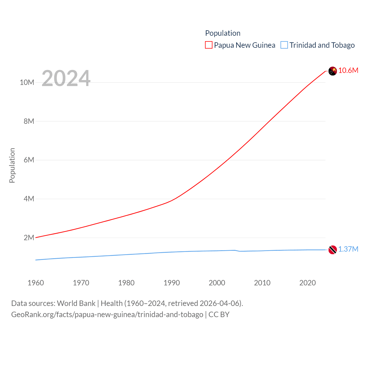 Papua New Guinea has a population of 10.6M (ranked 92/197), compared with 1.37M in Trinidad and Tobago (ranked 154/197). Papua New Guinea's land area is 174,850 sq mi versus 1,981 sq mi for Trinidad and Tobago (ranked 54th vs. 166th).
