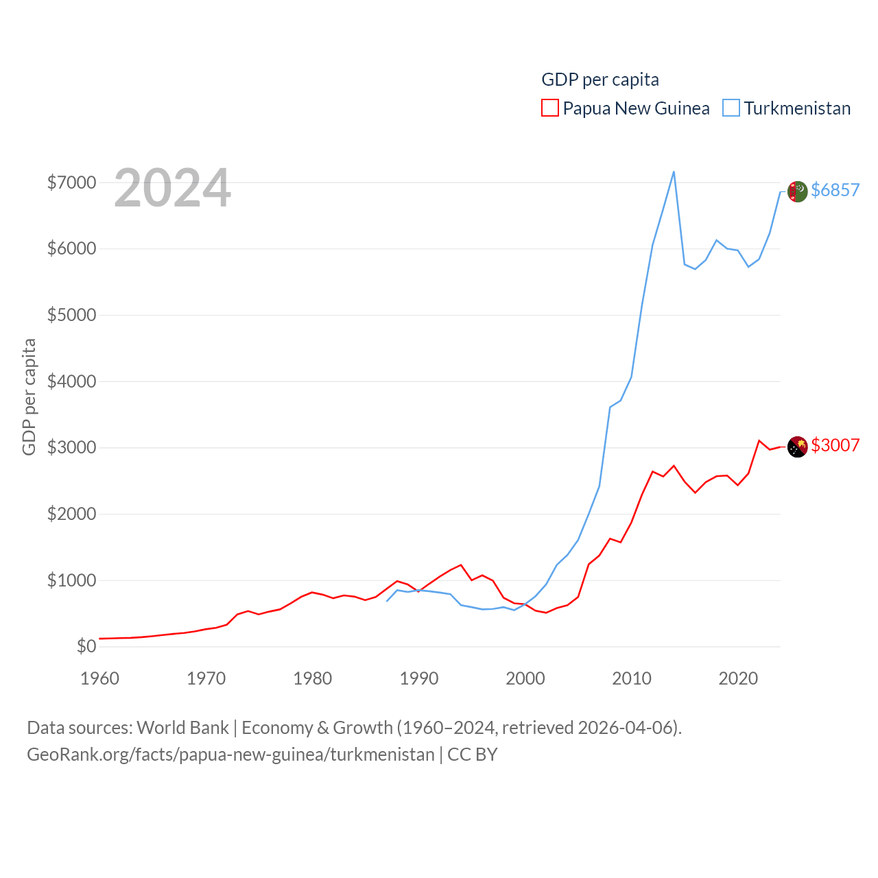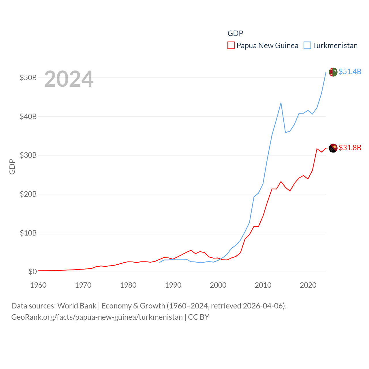 By GDP, Papua New Guinea ranks 110/197 ($31.8B) and Turkmenistan ranks 92/197 ($51.4B). By GDP per capita, Papua New Guinea ranks 140/197 ($3,007), while Turkmenistan ranks 104/197 ($6,857).