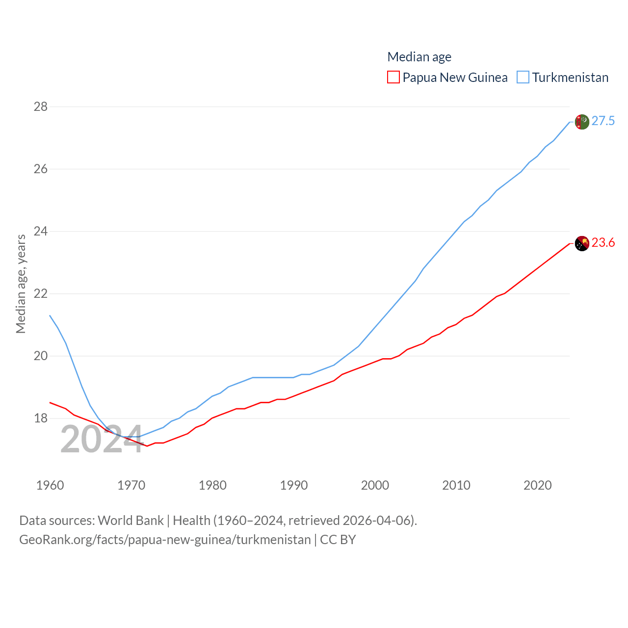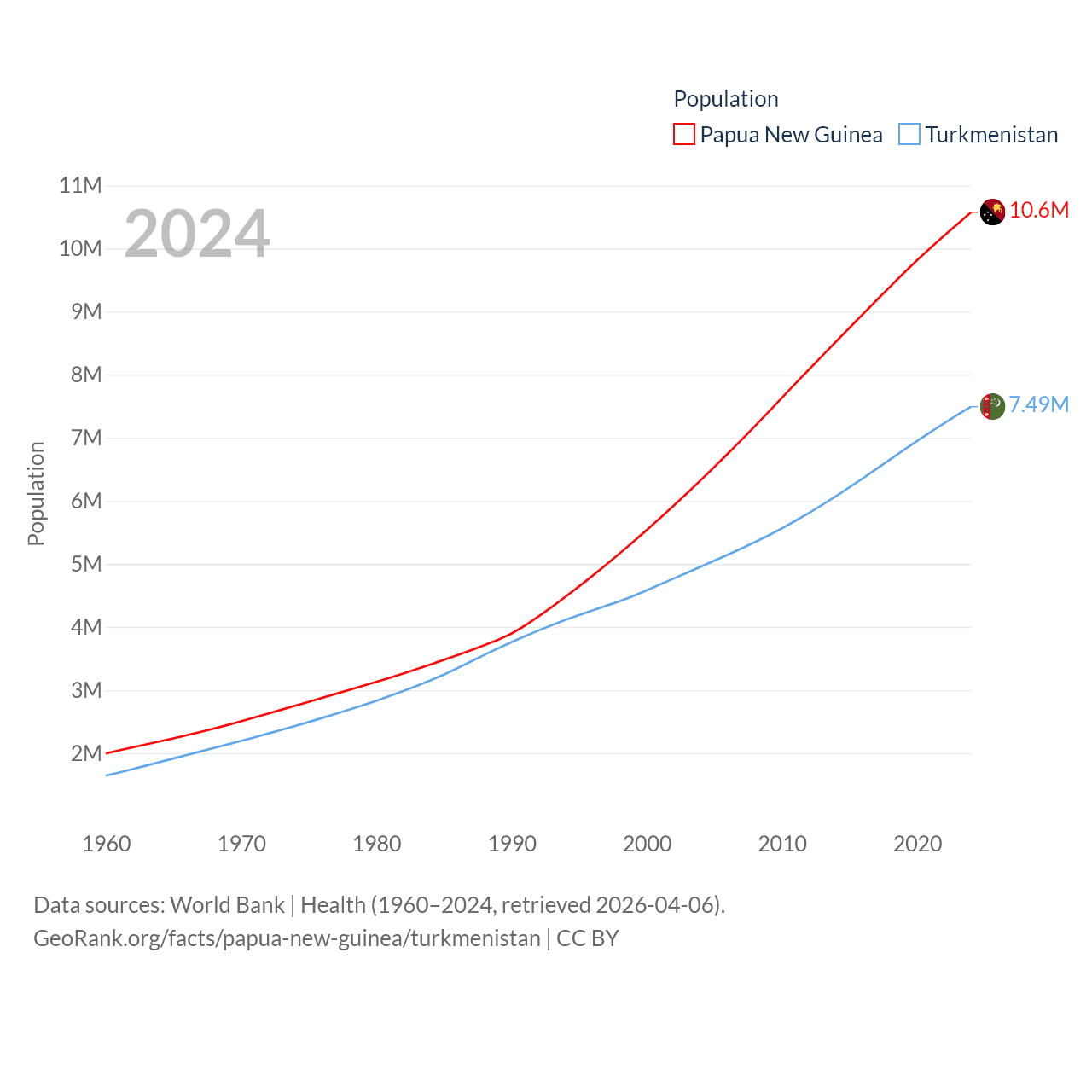 Papua New Guinea has a population of 10.6M (ranked 92/197), compared with 7.49M in Turkmenistan (ranked 104/197). Papua New Guinea's land area is 174,850 sq mi versus 181,441 sq mi for Turkmenistan (ranked 54th vs. 53rd).