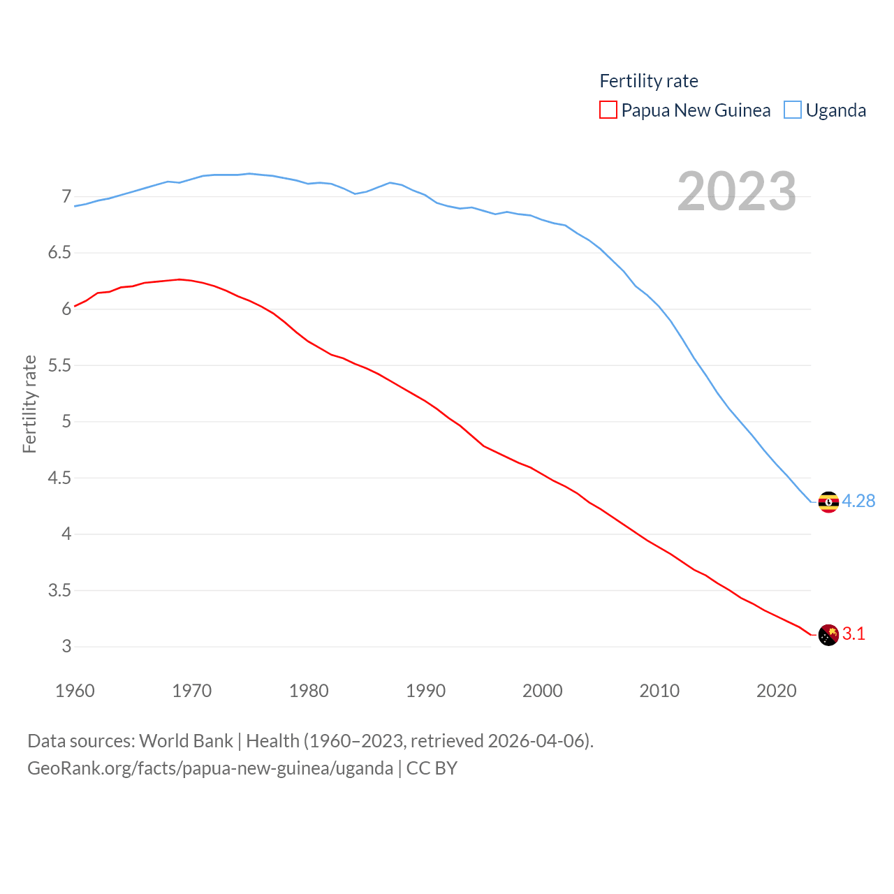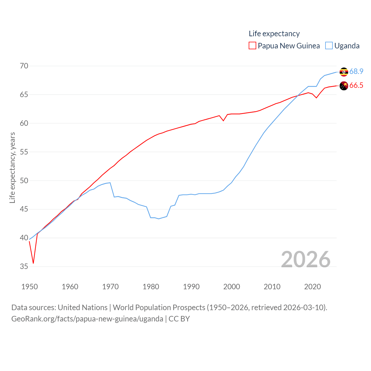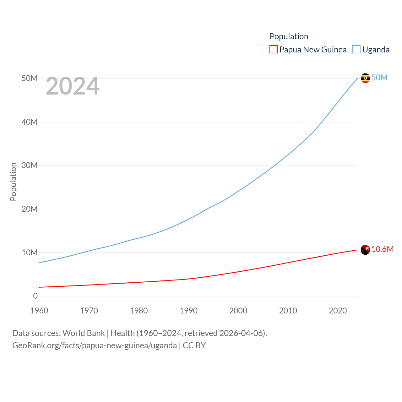 Papua New Guinea has a population of 10.6M (ranked 92/197), compared with 50M in Uganda (ranked 31/197). Papua New Guinea's land area is 174,850 sq mi versus 77,421 sq mi for Uganda (ranked 54th vs. 84th).