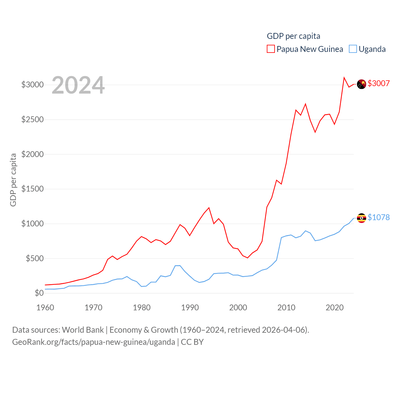 By GDP, Papua New Guinea ranks 110/197 ($31.8B) and Uganda ranks 89/197 ($53.9B). By GDP per capita, Papua New Guinea ranks 140/197 ($3,007), while Uganda ranks 176/197 ($1,078).