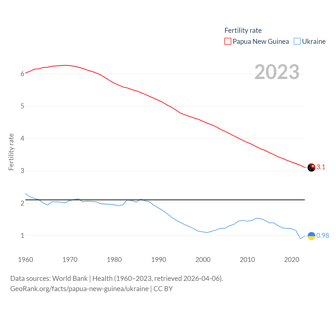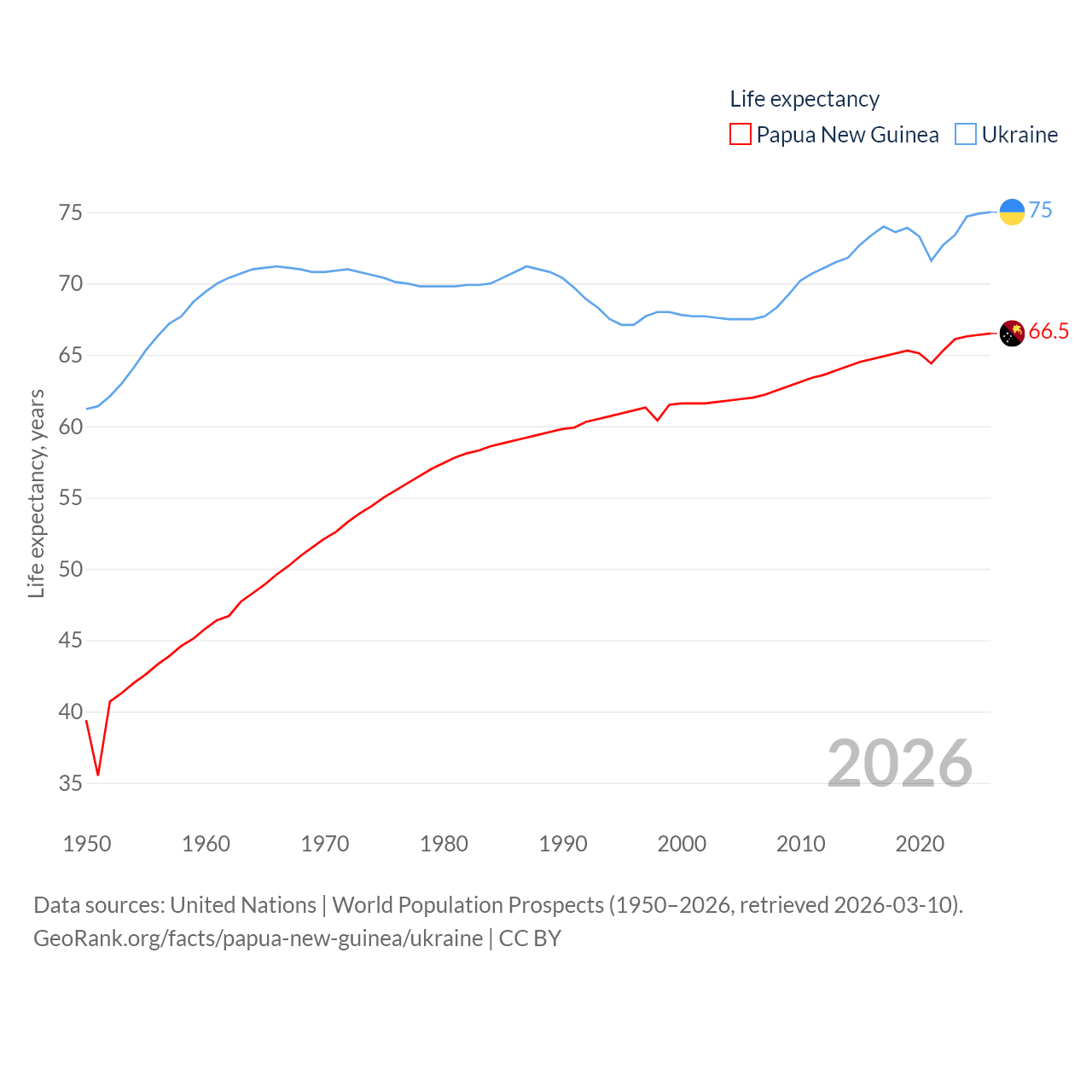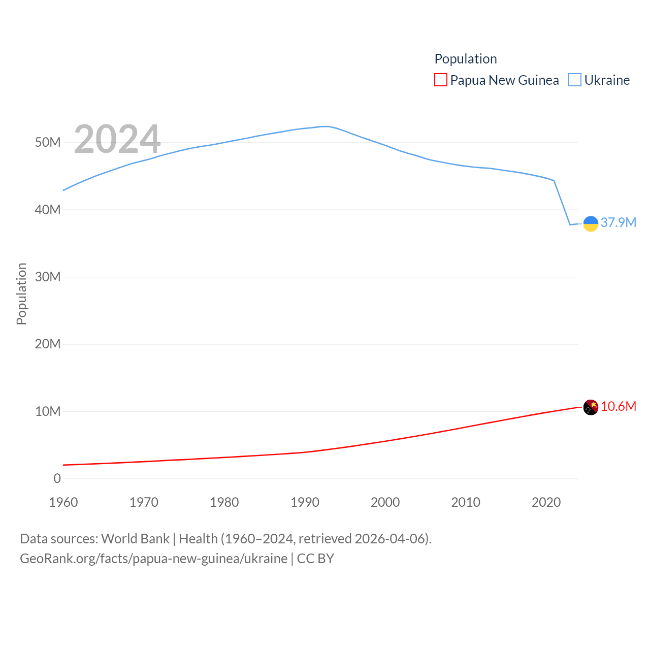Papua New Guinea has a population of 10.6M (ranked 92/197), compared with 37.9M in Ukraine (ranked 41/197). Papua New Guinea's land area is 174,850 sq mi versus 223,708 sq mi for Ukraine (ranked 54th vs. 46th).