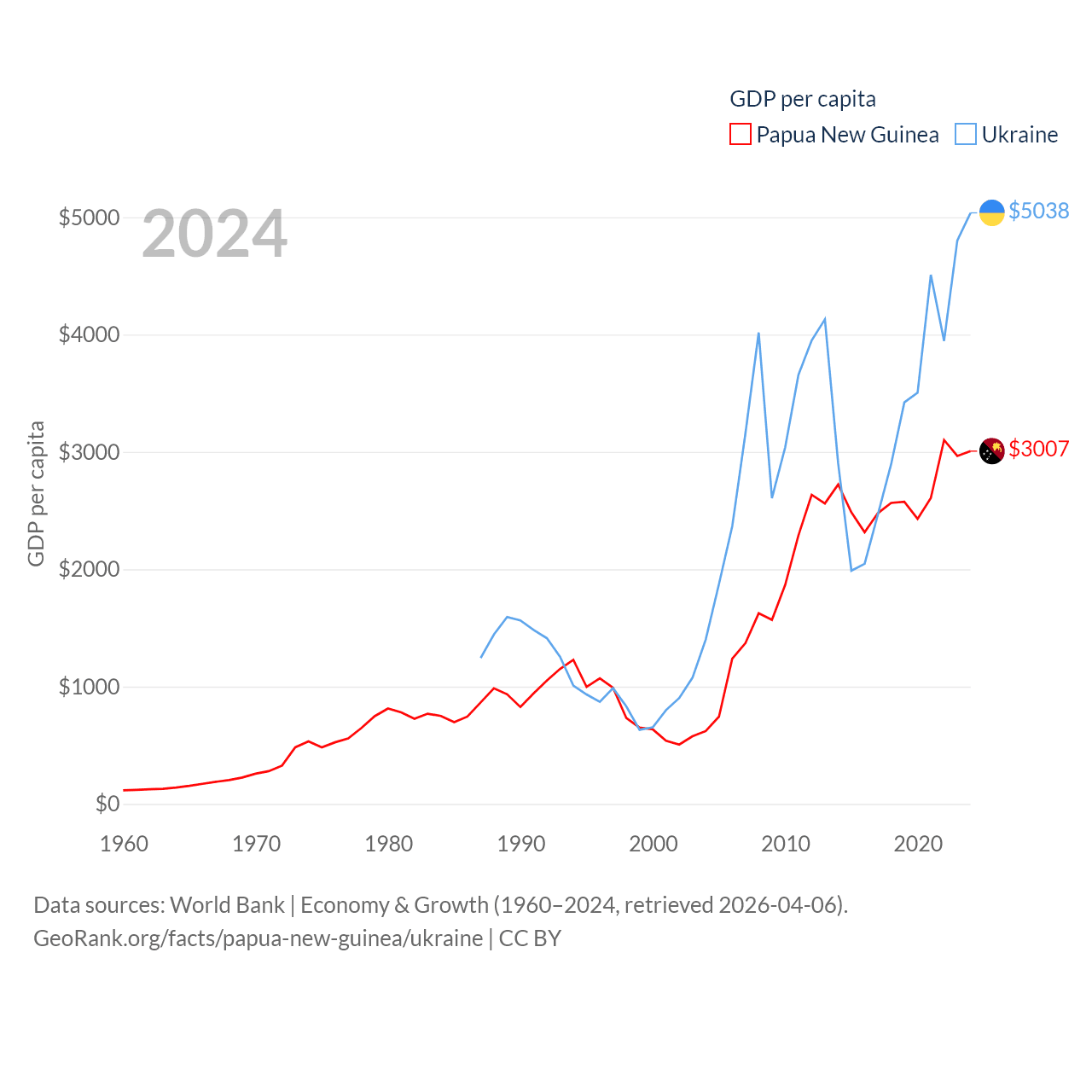 By GDP, Papua New Guinea ranks 110/197 ($31.8B) and Ukraine ranks 57/197 ($191B). By GDP per capita, Papua New Guinea ranks 140/197 ($3,007), while Ukraine ranks 120/197 ($5,038).