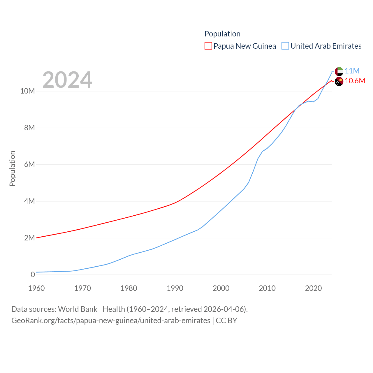 Papua New Guinea has a population of 10.6M (ranked 92/197), compared with 11M in The United Arab Emirates (ranked 86/197). Papua New Guinea's land area is 174,850 sq mi versus 27,421 sq mi for The United Arab Emirates (ranked 54th vs. 117th).