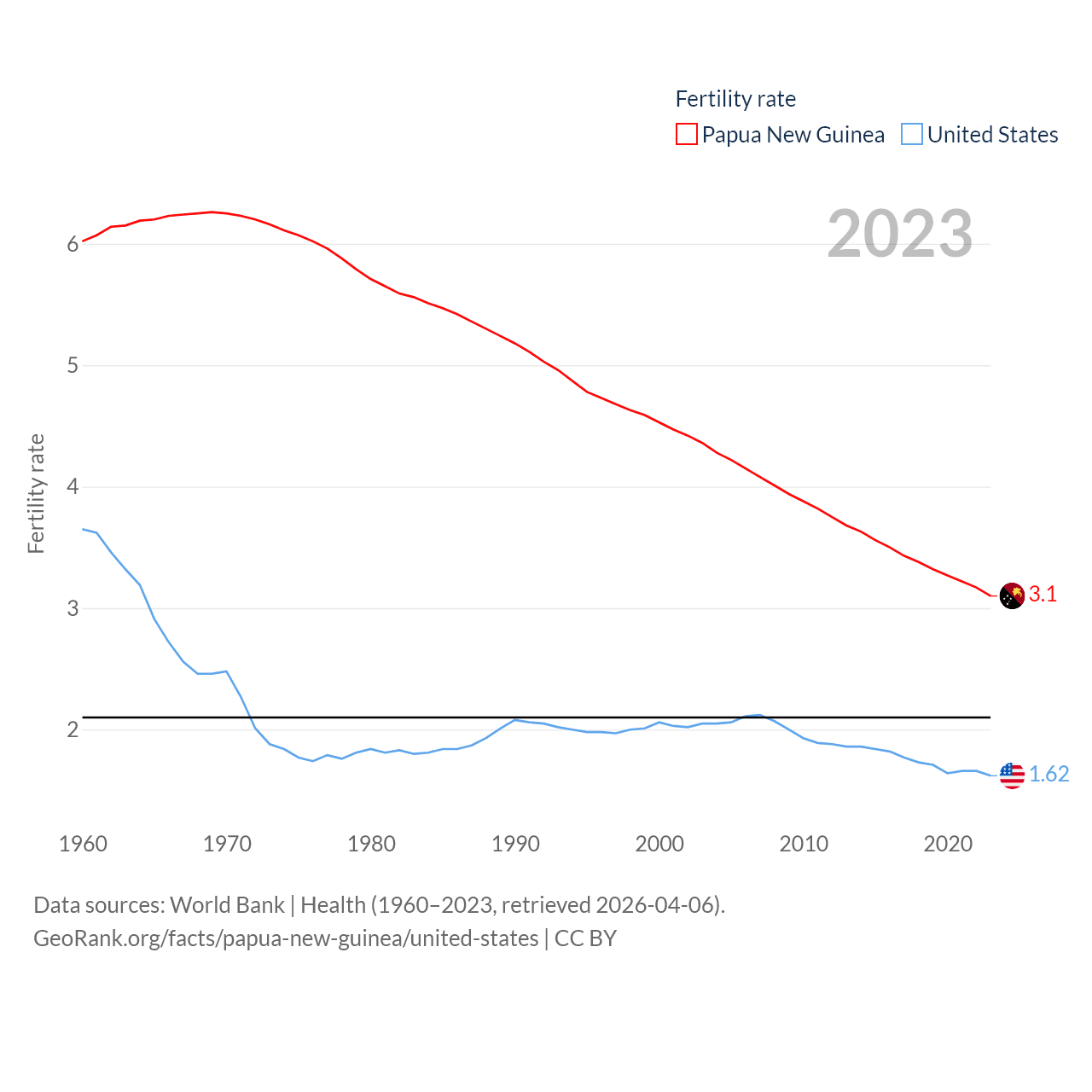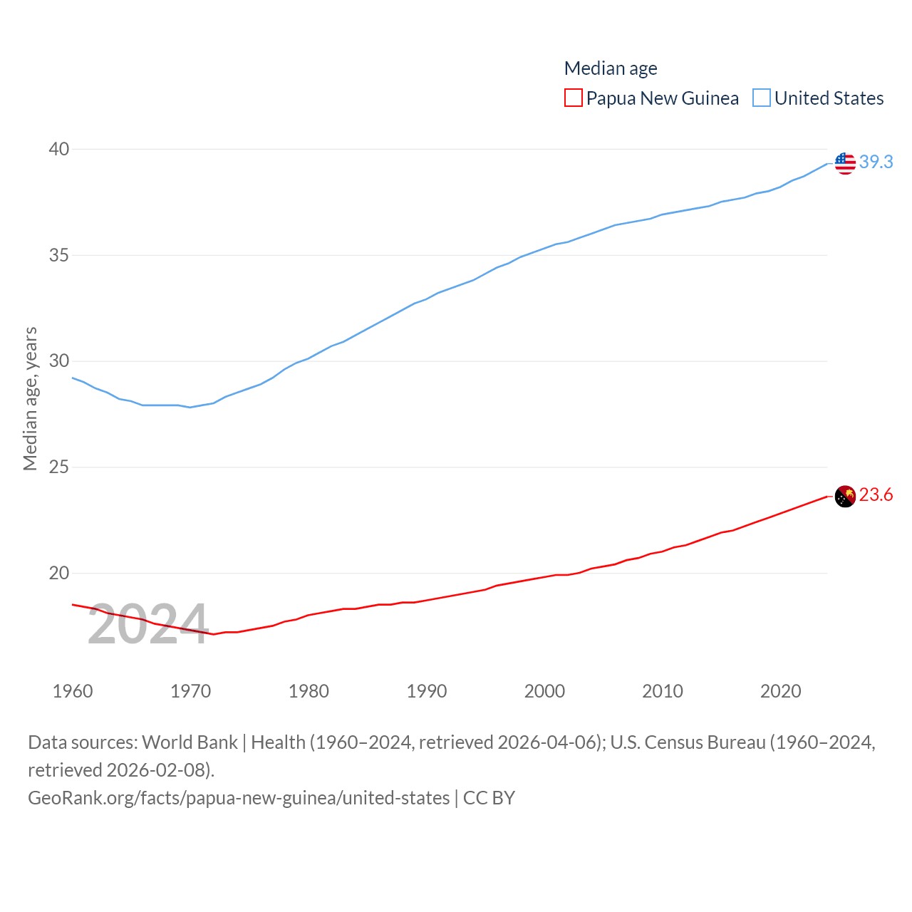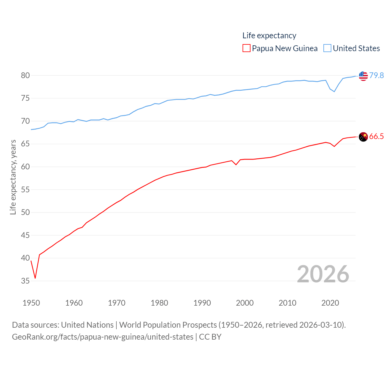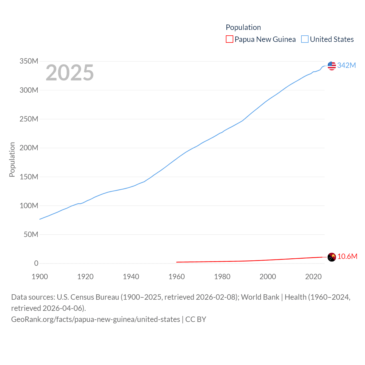 Papua New Guinea has a population of 10.6M (ranked 92/197), compared with 342M in The United States (ranked 3/197). Papua New Guinea's land area is 174,850 sq mi versus 3,531,839 sq mi for The United States (ranked 54th vs. 3rd).