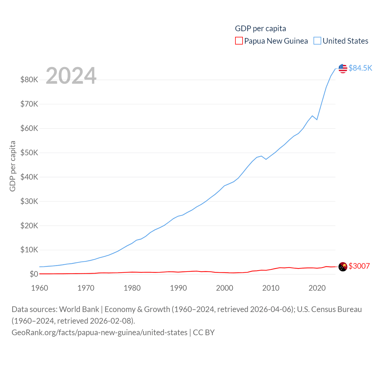 By GDP, Papua New Guinea ranks 110/197 ($31.8B) and The United States ranks 1/197 ($28.8T). By GDP per capita, Papua New Guinea ranks 140/197 ($3,007), while The United States ranks 10/197 ($84,534).