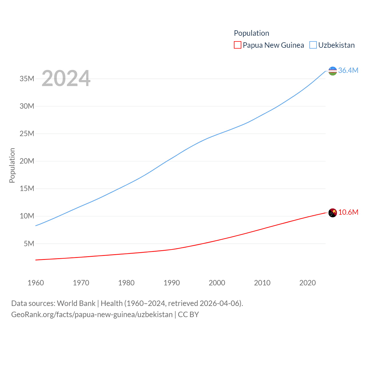 Papua New Guinea has a population of 10.6M (ranked 92/197), compared with 36.4M in Uzbekistan (ranked 43/197). Papua New Guinea's land area is 174,850 sq mi versus 170,136 sq mi for Uzbekistan (ranked 54th vs. 56th).