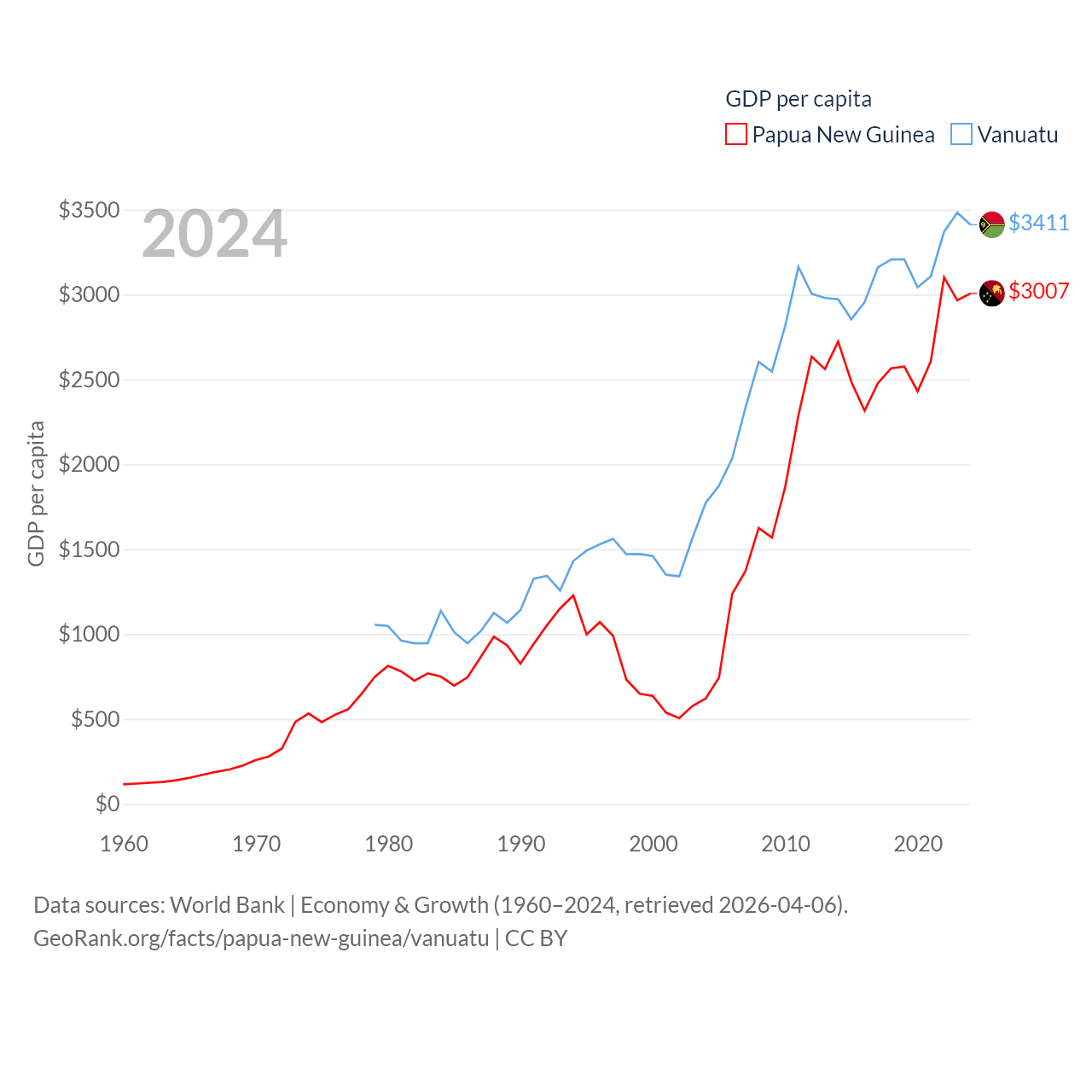 By GDP, Papua New Guinea ranks 110/197 ($31.8B) and Vanuatu ranks 188/197 ($1.12B). By GDP per capita, Papua New Guinea ranks 140/197 ($3,007), while Vanuatu ranks 137/197 ($3,411).