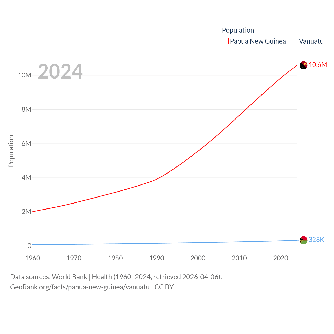 Papua New Guinea has a population of 10.6M (ranked 92/197), compared with 328K in Vanuatu (ranked 174/197). Papua New Guinea's land area is 174,850 sq mi versus 4,707 sq mi for Vanuatu (ranked 54th vs. 157th).