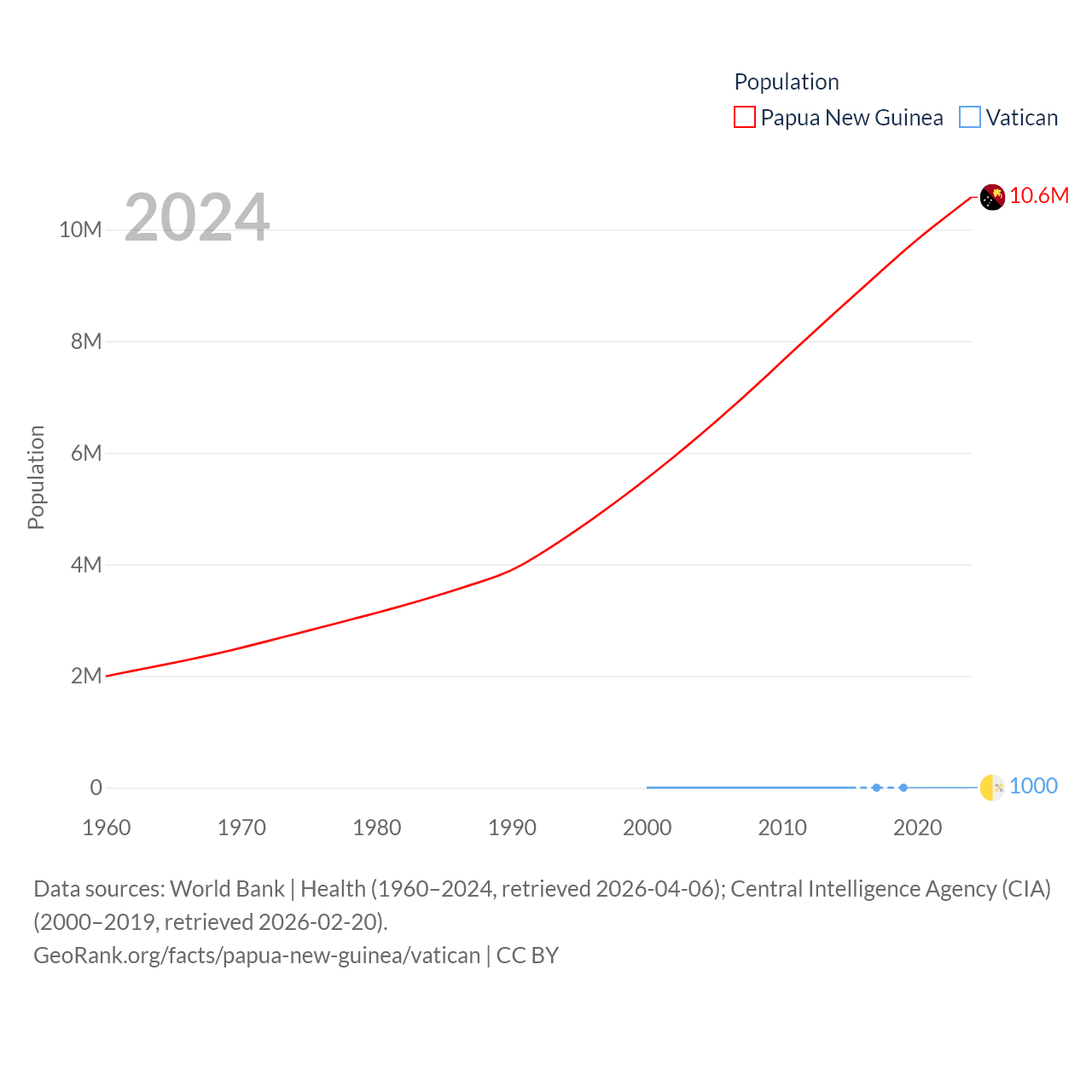 Papua New Guinea has a population of 10.6M (ranked 92/197), compared with 1K in The Vatican (ranked 197/197). Papua New Guinea's land area is 174,850 sq mi versus 0.17 sq mi for The Vatican (ranked 54th vs. 197th).