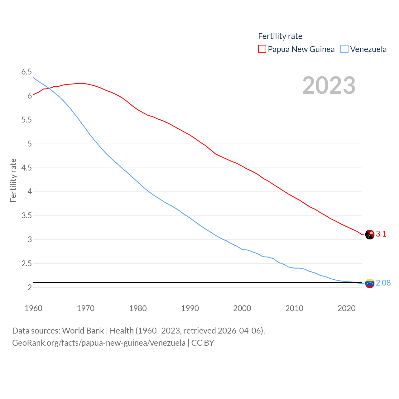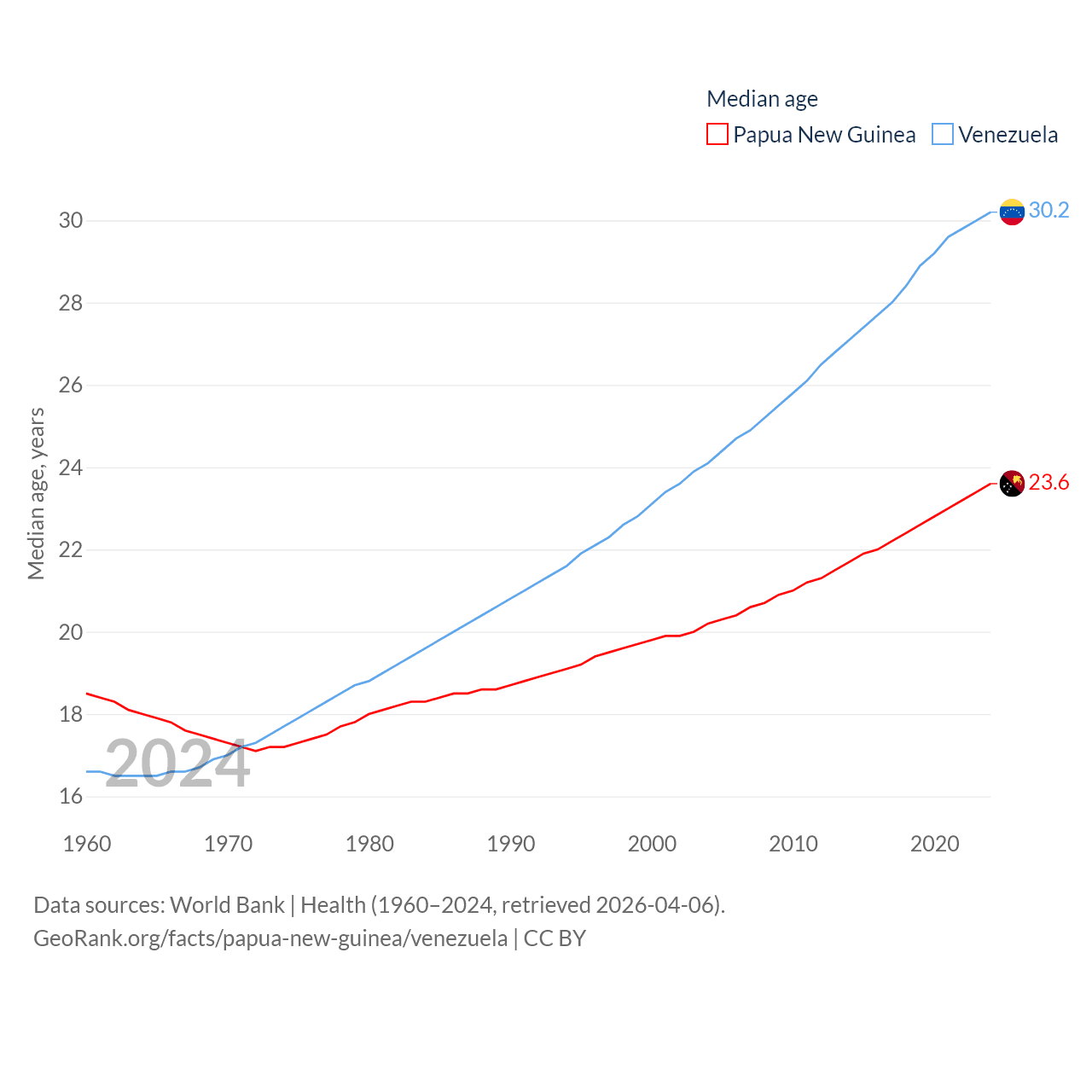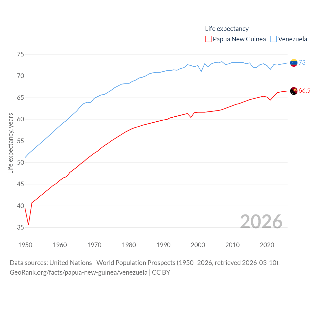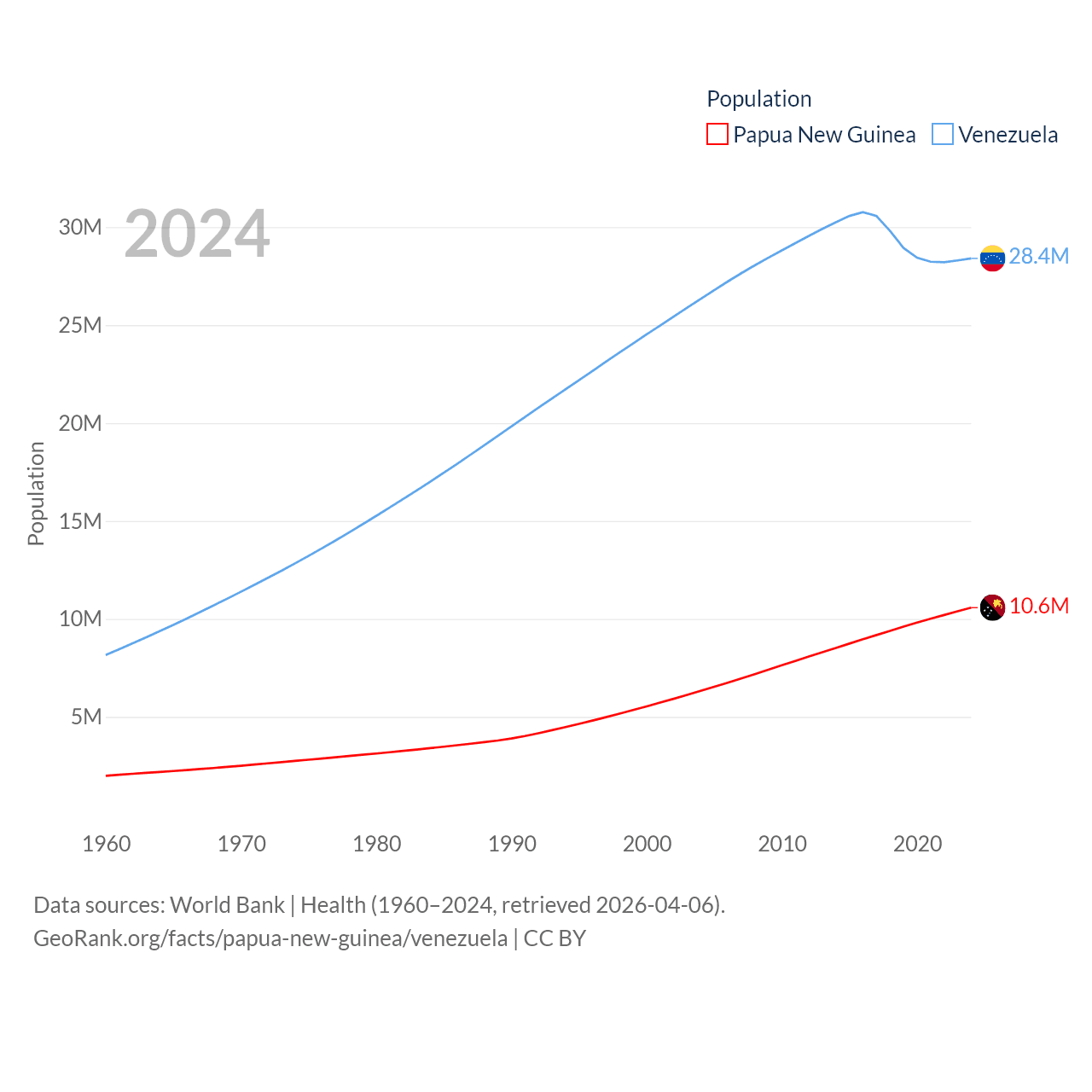 Papua New Guinea has a population of 10.6M (ranked 92/197), compared with 28.4M in Venezuela (ranked 53/197). Papua New Guinea's land area is 174,850 sq mi versus 340,561 sq mi for Venezuela (ranked 54th vs. 32nd).