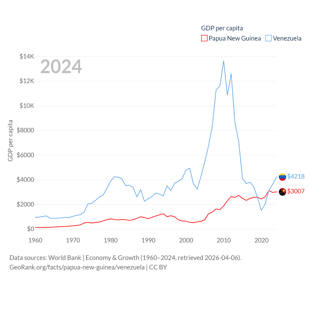 By GDP, Papua New Guinea ranks 110/197 ($31.8B) and Venezuela ranks 65/197 ($120B). By GDP per capita, Papua New Guinea ranks 140/197 ($3,007), while Venezuela ranks 128/197 ($4,218).