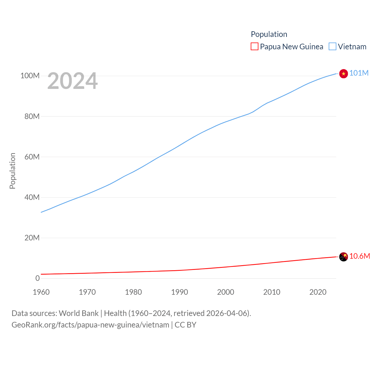 Papua New Guinea has a population of 10.6M (ranked 92/197), compared with 101M in Vietnam (ranked 16/197). Papua New Guinea's land area is 174,850 sq mi versus 121,016 sq mi for Vietnam (ranked 54th vs. 67th).