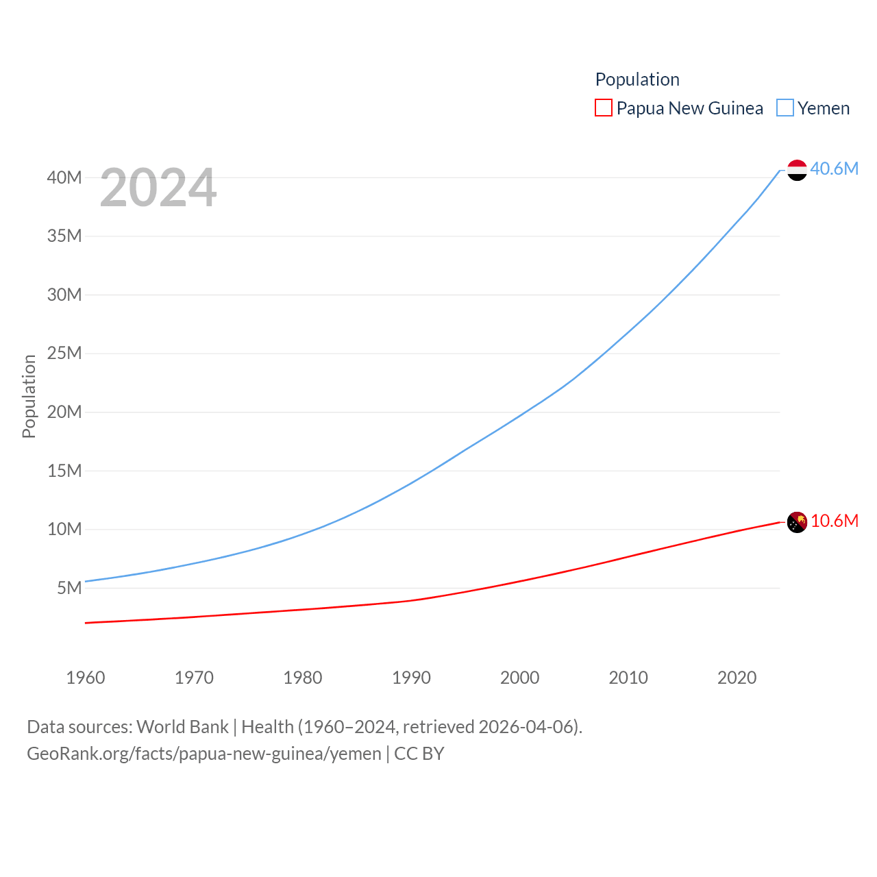 Papua New Guinea has a population of 10.6M (ranked 92/197), compared with 40.6M in Yemen (ranked 38/197). Papua New Guinea's land area is 174,850 sq mi versus 203,850 sq mi for Yemen (ranked 54th vs. 49th).
