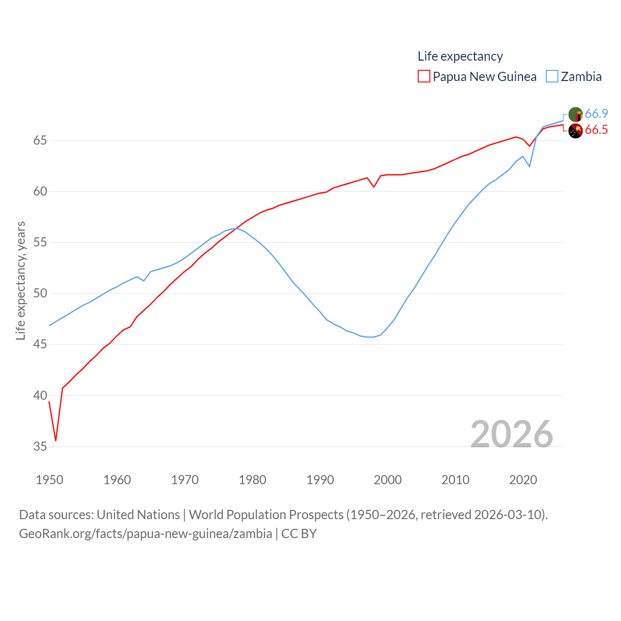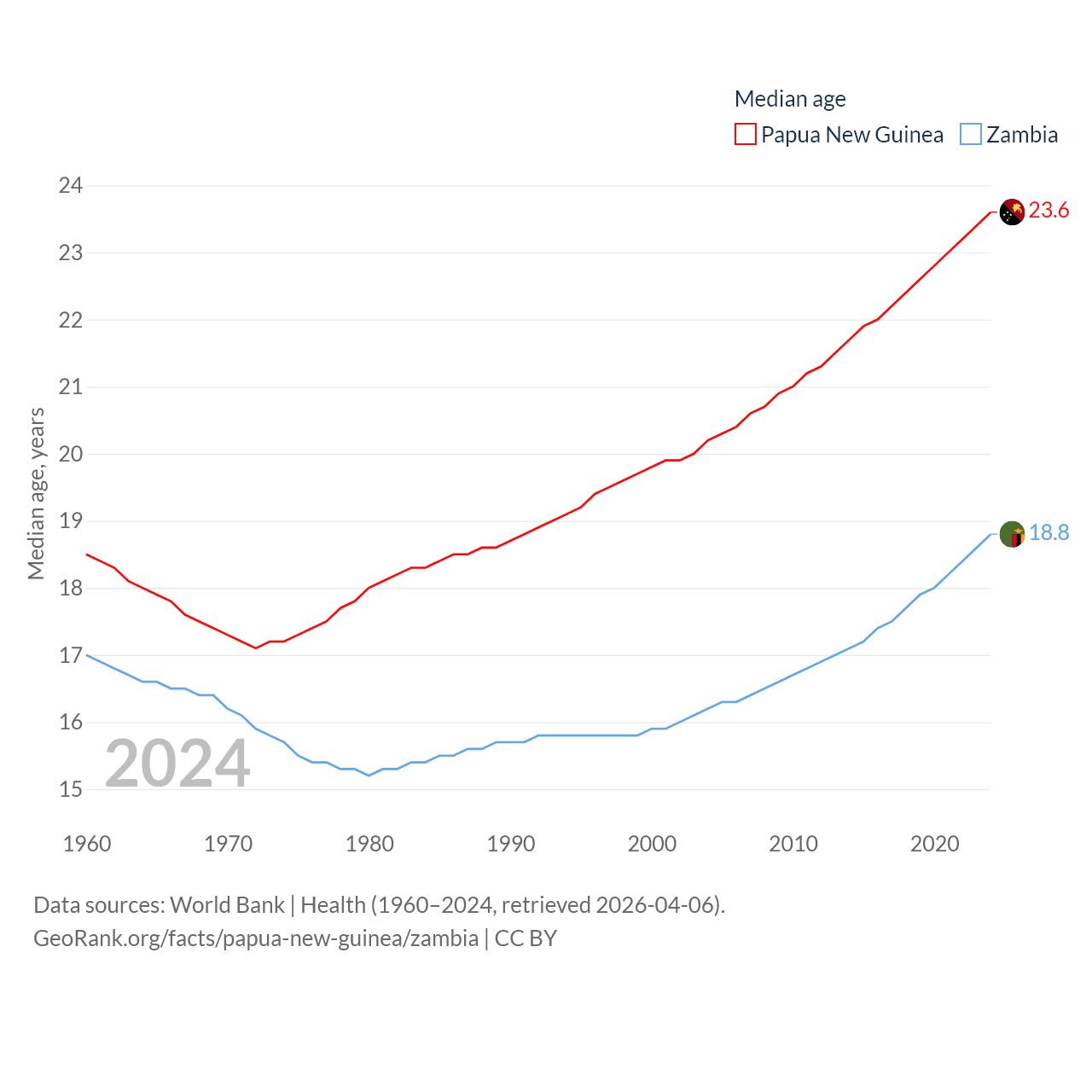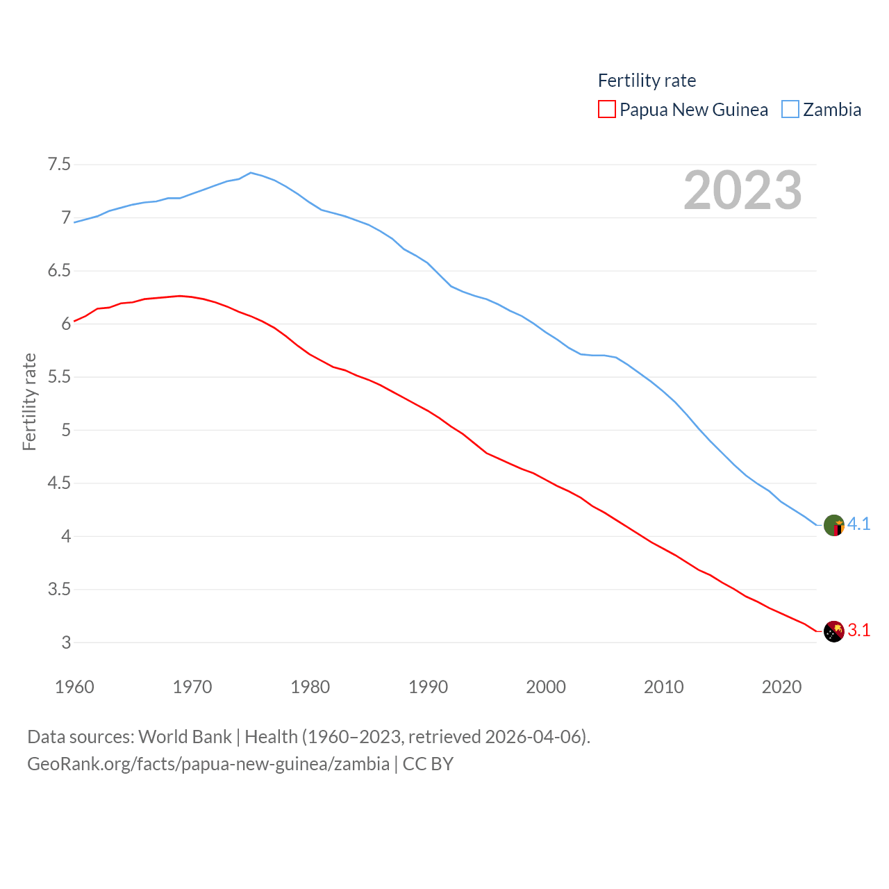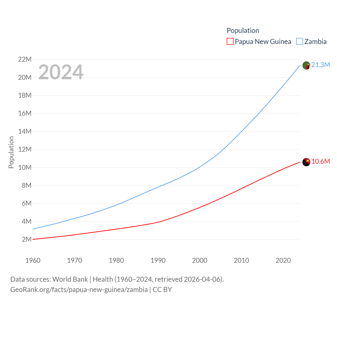 Papua New Guinea has a population of 10.6M (ranked 92/197), compared with 21.3M in Zambia (ranked 63/197). Papua New Guinea's land area is 174,850 sq mi versus 287,024 sq mi for Zambia (ranked 54th vs. 37th).