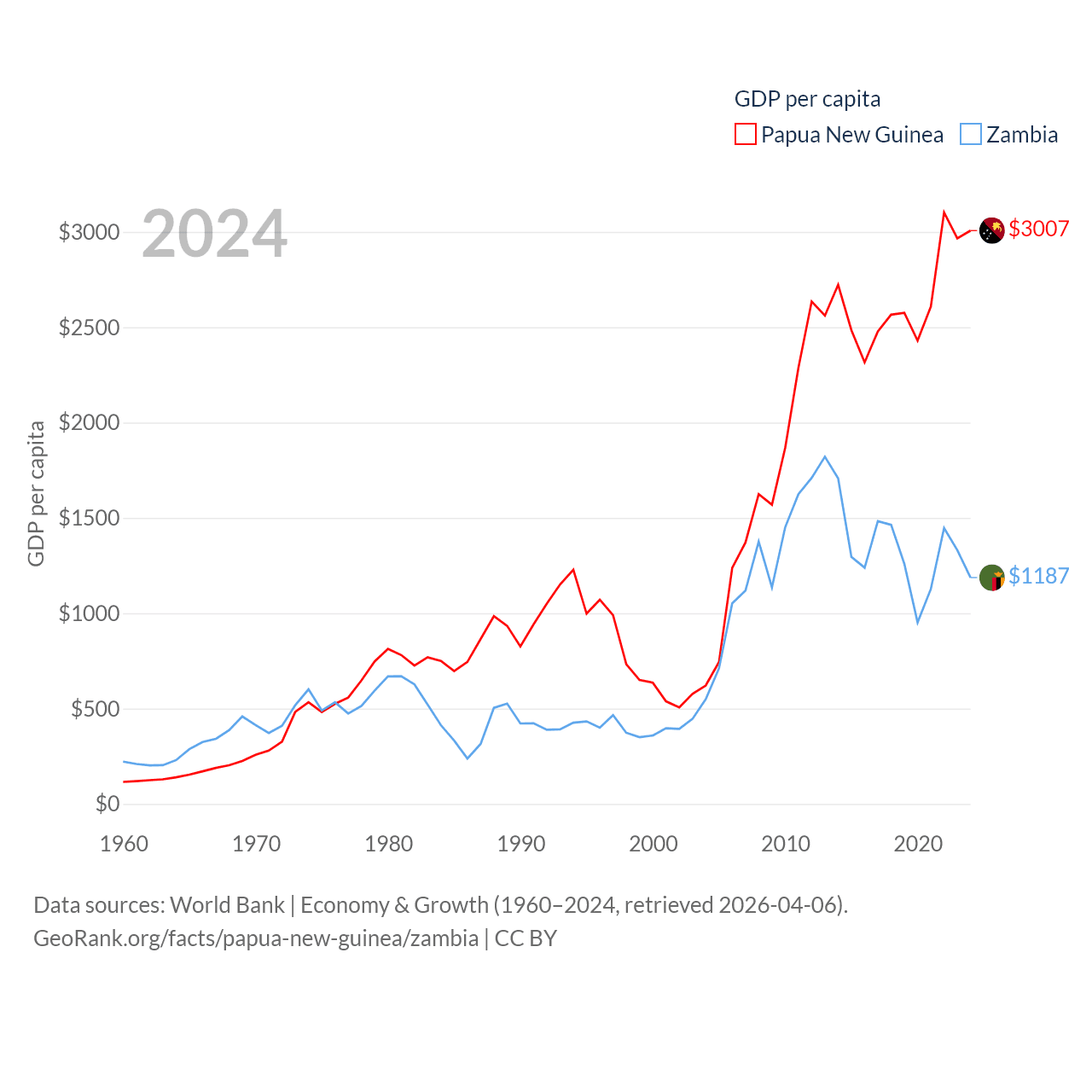 By GDP, Papua New Guinea ranks 110/197 ($31.8B) and Zambia ranks 116/197 ($25.3B). By GDP per capita, Papua New Guinea ranks 140/197 ($3,007), while Zambia ranks 169/197 ($1,187).