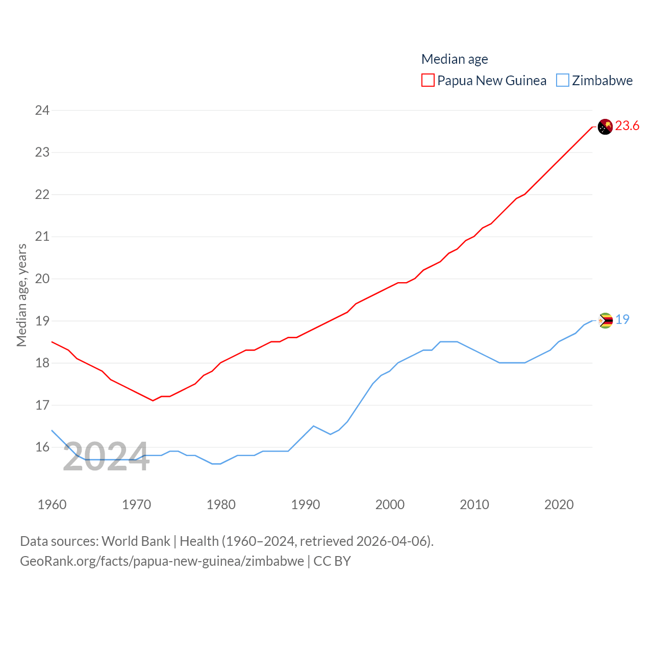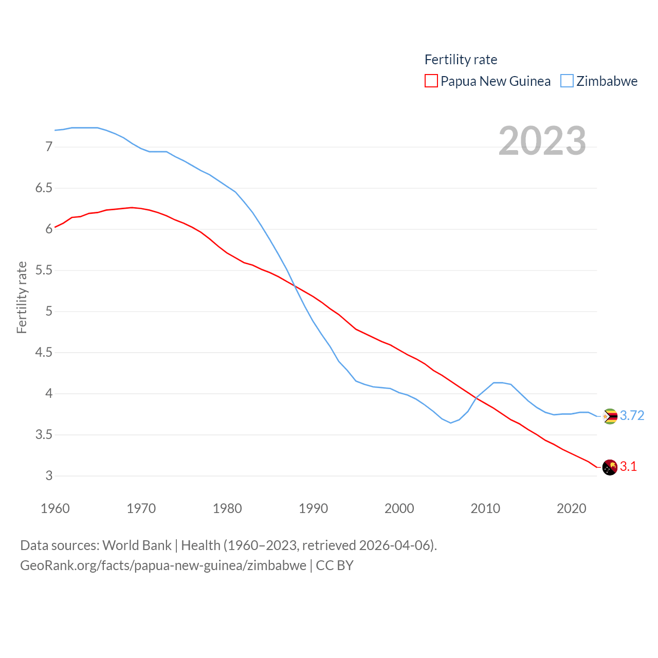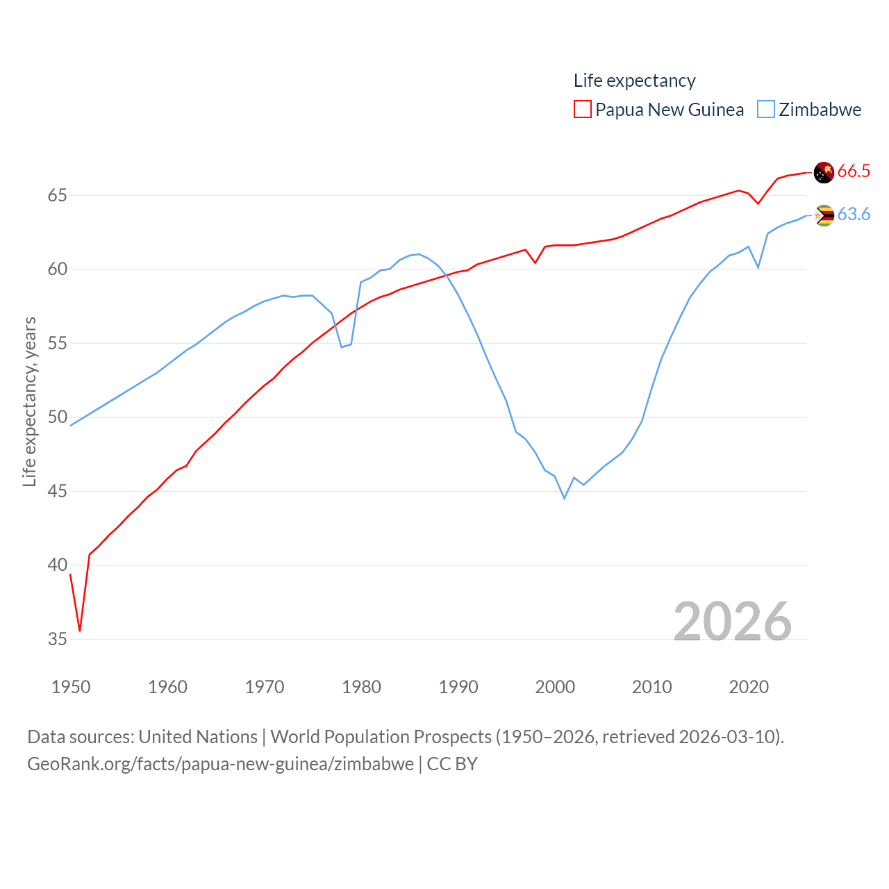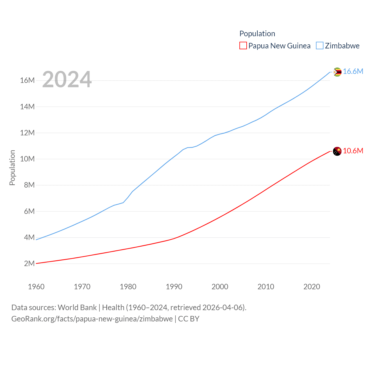 Papua New Guinea has a population of 10.6M (ranked 92/197), compared with 16.6M in Zimbabwe (ranked 74/197). Papua New Guinea's land area is 174,850 sq mi versus 149,364 sq mi for Zimbabwe (ranked 54th vs. 60th).